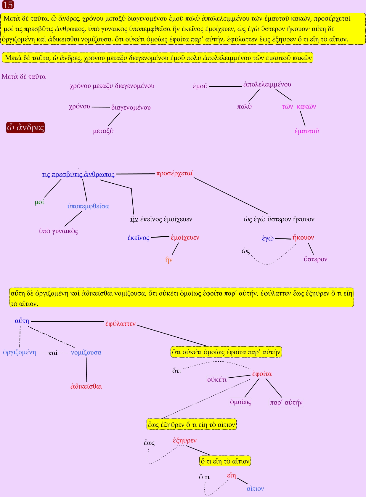 Este Cmap, tiene información relacionada con: frag.15, ἀδικεῖσθαι ???? νομίζουσα, νομίζουσα ???? αὕτη, αἴτιον ???? εἴη, ὡς ???? ἤκουον, ὅτι ???? ἐφοίτα, αὕτη ???? ἐφύλαττεν, τις πρεσβῦτις ἄνθρωπος ???? προσέρχεταί, ἐφοίτα ???? ἕως ἐξηῦρεν ὅ τι εἴη τὸ αἴτιον, ὁμοίως ???? ἐφοίτα, ἐκεῖνος ???? ἐμοίχευεν, τῶν κακῶν ???? ἀπολελειμμένου, μεταξὺ ???? διαγενομένου, καὶ ???? ὀργιζομένη, ἐγὼ ???? ἤκουον, πολὺ ???? ἀπολελειμμένου, ὅ τι εἴη τὸ αἴτιον ???? ἐξηῦρεν, ἣν ???? ἐμοίχευεν, ἐμοῦ ???? ἀπολελειμμένου, ὅ τι ???? εἴη, χρόνου ???? διαγενομένου