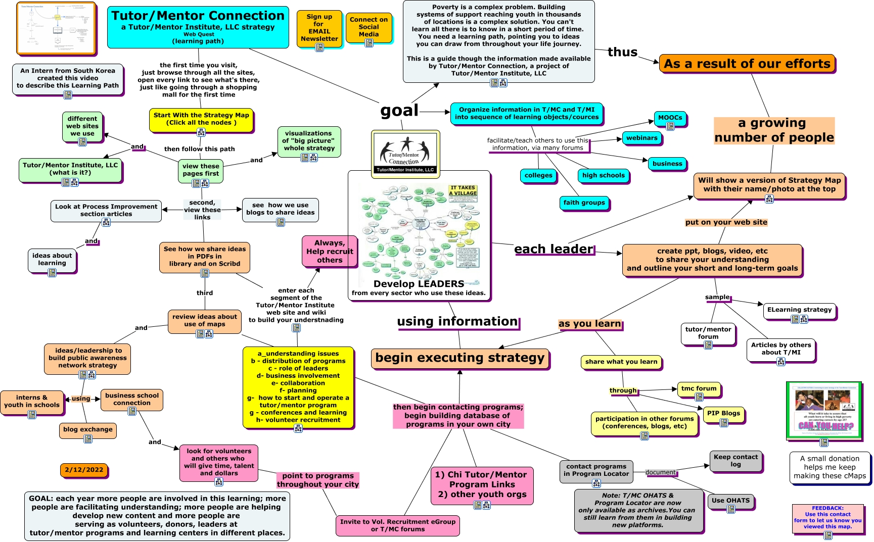 This Concept Map, created with IHMC CmapTools, has information related to: TMC First weeks on job, view these pages first and visualizations of "big picture" whole strategy, Organize information in T/MC and T/MI into sequence of learning objects/cources facilitate/teach others to use this information, via many forums colleges, ideas/leadership to build public awareness network strategy using interns & youth in schools, Organize information in T/MC and T/MI into sequence of learning objects/cources facilitate/teach others to use this information, via many forums faith groups, view these pages first and different web sites we use, view these pages first second, view these links See how we share ideas in PDFs in library and on Scribd, Tutor/Mentor Connection a Tutor/Mentor Institute, LLC strategy Web Quest (learning path) goal Poverty is a complex problem. Building systems of support reaching youth in thousands of locations is a complex solution. You can't learn all there is to know in a short period of time. You need a learning path, pointing you to ideas you can draw from throughout your life journey. This is a guide though the information made available by Tutor/Mentor Connection, a project of Tutor/Mentor Institute, LLC, share what you learn through participation in other forums (conferences, blogs, etc), create ppt, blogs, video, etc to share your understanding and outline your short and long-term goals sample Articles by others about T/MI, ideas/leadership to build public awareness network strategy using business school connection, See how we share ideas in PDFs in library and on Scribd enter each segment of the Tutor/Mentor Institute web site and wiki to build your understnading Always, Help recruit others, review ideas about use of maps then begin contacting programs; begin building database of programs in your own city begin executing strategy, share what you learn through PIP Blogs, Develop LEADERS from every sector who use these ideas. using information begin executing strategy, Organize information in T/MC and T/MI into sequence of learning objects/cources facilitate/teach others to use this information, via many forums high schools, As a result of our efforts a growing number of people Will show a version of Strategy Map with their name/photo at the top, Start With the Strategy Map (Click all the nodes ) then follow this path view these pages first, view these pages first second, view these links Look at Process Improvement section articles, review ideas about use of maps then begin contacting programs; begin building database of programs in your own city Invite to Vol. Recruitment eGroup or T/MC forums, Develop LEADERS from every sector who use these ideas. each leader create ppt, blogs, video, etc to share your understanding and outline your short and long-term goals