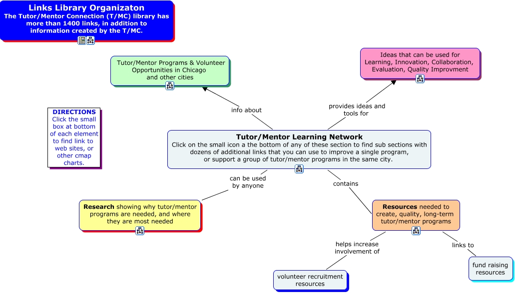 This Concept Map has information related to: Learning Network Library, Tutor/Mentor Learning Network Click on the small icon a the bottom of any of these section to find sub sections with dozens of additional links that you can use to improve a single program, or support a group of tutor/mentor programs in the same city. can be used by anyone Research showing why tutor/mentor programs are needed, and where they are most needed, Tutor/Mentor Learning Network Click on the small icon a the bottom of any of these section to find sub sections with dozens of additional links that you can use to improve a single program, or support a group of tutor/mentor programs in the same city. contains Resources needed to create, quality, long-term tutor/mentor programs, Resources needed to create, quality, long-term tutor/mentor programs helps increase involvement of volunteer recruitment resources, Tutor/Mentor Learning Network Click on the small icon a the bottom of any of these section to find sub sections with dozens of additional links that you can use to improve a single program, or support a group of tutor/mentor programs in the same city. info about Tutor/Mentor Programs & Volunteer Opportunities in Chicago and other cities, Tutor/Mentor Learning Network Click on the small icon a the bottom of any of these section to find sub sections with dozens of additional links that you can use to improve a single program, or support a group of tutor/mentor programs in the same city. provides ideas and tools for Ideas that can be used for Learning, Innovation, Collaboration, Evaluation, Quality Improvment, Resources needed to create, quality, long-term tutor/mentor programs links to fund raising resources