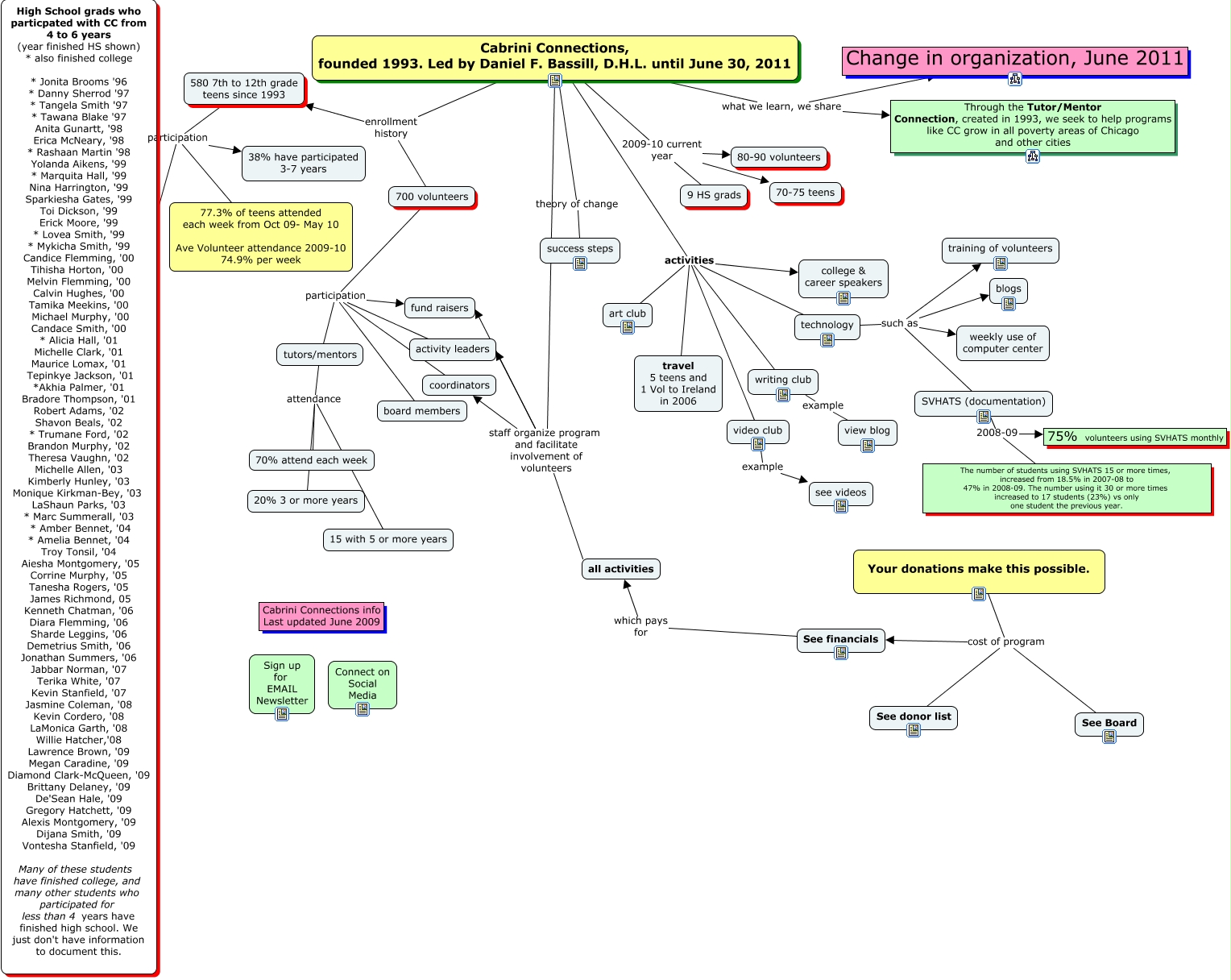 This Concept Map, created with IHMC CmapTools, has information related to: metrics for Cabrini Connections, Your donations make this possible. cost of program See Board, Cabrini Connections, founded 1993. Led by Daniel F. Bassill, D.H.L. until June 30, 2011 activities video club, Your donations make this possible. cost of program See financials, Cabrini Connections, founded 1993. Led by Daniel F. Bassill, D.H.L. until June 30, 2011 staff organize program and facilitate involvement of volunteers activity leaders, 700 volunteers participation fund raisers, Cabrini Connections, founded 1993. Led by Daniel F. Bassill, D.H.L. until June 30, 2011 staff organize program and facilitate involvement of volunteers coordinators, Cabrini Connections, founded 1993. Led by Daniel F. Bassill, D.H.L. until June 30, 2011 activities travel 5 teens and 1 Vol to Ireland in 2006, Cabrini Connections, founded 1993. Led by Daniel F. Bassill, D.H.L. until June 30, 2011 activities art club, 580 7th to 12th grade teens since 1993 participation 77.3% of teens attended each week from Oct 09- May 10 Ave Volunteer attendance 2009-10 74.9% per week, video club example see videos, Your donations make this possible. cost of program See donor list, 580 7th to 12th grade teens since 1993 participation 38% have participated 3-7 years, technology such as weekly use of computer center, Cabrini Connections, founded 1993. Led by Daniel F. Bassill, D.H.L. until June 30, 2011 activities college & career speakers, Cabrini Connections, founded 1993. Led by Daniel F. Bassill, D.H.L. until June 30, 2011 staff organize program and facilitate involvement of volunteers fund raisers, Cabrini Connections, founded 1993. Led by Daniel F. Bassill, D.H.L. until June 30, 2011 2009-10 current year 80-90 volunteers, Cabrini Connections, founded 1993. Led by Daniel F. Bassill, D.H.L. until June 30, 2011 what we learn, we share Change in organization, June 2011, 580 7th to 12th grade teens since 1993 participation High School grads who particpated with CC from 4 to 6 years (year finished HS shown) * also finished college * Jonita Brooms '96 * Danny Sherrod '97 * Tangela Smith '97 * Tawana Blake '97 Anita Gunartt, '98 Erica McNeary, '98 * Rashaan Martin '98 Yolanda Aikens, '99 * Marquita Hall, '99 Nina Harrington, '99 Sparkiesha Gates, '99 Toi Dickson, '99 Erick Moore, '99 * Lovea Smith, '99 * Mykicha Smith, '99 Candice Flemming, '00 Tihisha Horton, '00 Melvin Flemming, '00 Calvin Hughes, '00 Tamika Meekins, '00 Michael Murphy, '00 Candace Smith, '00 * Alicia Hall, '01 Michelle Clark, '01 Maurice Lomax, '01 Tepinkye Jackson, '01 *Akhia Palmer, '01 Bradore Thompson, '01 Robert Adams, '02 Shavon Beals, '02 * Trumane Ford, '02 Brandon Murphy, '02 Theresa Vaughn, '02 Michelle Allen, '03 Kimberly Hunley, '03 Monique Kirkman-Bey, '03 LaShaun Parks, '03 * Marc Summerall, '03 * Amber Bennet, '04 * Amelia Bennet, '04 Troy Tonsil, '04 Aiesha Montgomery, '05 Corrine Murphy, '05 Tanesha Rogers, '05 James Richmond, 05 Kenneth Chatman, '06 Diara Flemming, '06 Sharde Leggins, '06 Demetrius Smith, '06 Jonathan Summers, '06 Jabbar Norman, '07 Terika White, '07 Kevin Stanfield, '07 Jasmine Coleman, '08 Kevin Cordero, '08 LaMonica Garth, '08 Willie Hatcher,'08 Lawrence Brown, '09 Megan Caradine, '09 Diamond Clark-McQueen, '09 Brittany Delaney, '09 De'Sean Hale, '09 Gregory Hatchett, '09 Alexis Montgomery, '09 Dijana Smith, '09 Vontesha Stanfield, '09 Many of these students have finished college, and many other students who participated for less than 4 years have finished high school. We just don't have information to document this., 700 volunteers participation coordinators, 700 volunteers participation activity leaders
