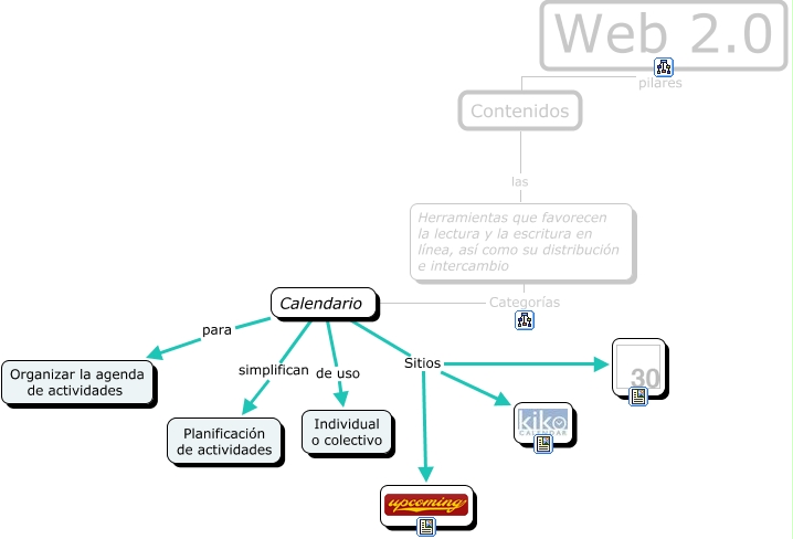 Este Cmap, tiene información relacionada con: Paginas Calendario, Calendario Sitios, Herramientas que favorecen la lectura y la escritura en línea, así como su distribución e intercambio Categorías Calendario, Calendario Sitios, Calendario Sitios, Contenidos las Herramientas que favorecen la lectura y la escritura en línea, así como su distribución e intercambio, Calendario de uso Individual o colectivo, Web 2.0 pilares Contenidos, Calendario simplifican Planificación de actividades, Calendario para Organizar la agenda de actividades