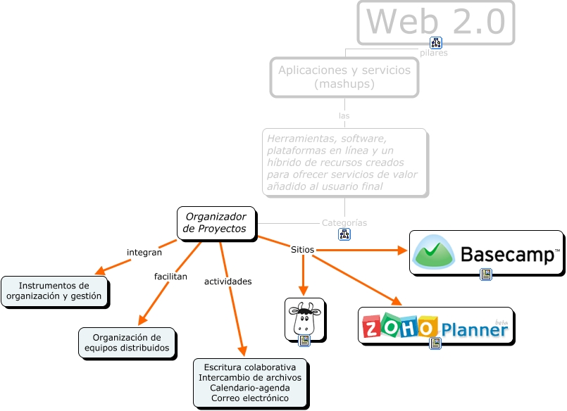 Este Cmap, tiene información relacionada con: Paginas Organizador de Proyectos, Organizador de Proyectos integran Instrumentos de organización y gestión, Organizador de Proyectos Sitios, Organizador de Proyectos Sitios, Organizador de Proyectos Sitios, Organizador de Proyectos actividades Escritura colaborativa Intercambio de archivos Calendario-agenda Correo electrónico, Organizador de Proyectos facilitan Organización de equipos distribuidos, Web 2.0 pilares Aplicaciones y servicios (mashups), Herramientas, software, plataformas en línea y un híbrido de recursos creados para ofrecer servicios de valor añadido al usuario final Categorías Organizador de Proyectos, Aplicaciones y servicios (mashups) las Herramientas, software, plataformas en línea y un híbrido de recursos creados para ofrecer servicios de valor añadido al usuario final