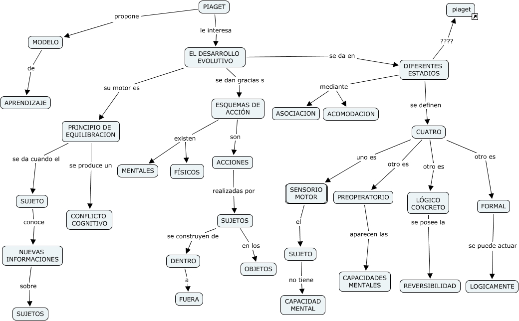 Este Cmap, tiene información relacionada con: estadios de piaget, ESQUEMAS DE ACCIÓN son ACCIONES, PIAGET propone MODELO, LÓGICO CONCRETO se posee la REVERSIBILIDAD, SUJETO conoce NUEVAS INFORMACIONES, ACCIONES realizadas por SUJETOS, PIAGET le interesa EL DESARROLLO EVOLUTIVO, SUJETO no tiene CAPACIDAD MENTAL, CUATRO otro es FORMAL, PREOPERATORIO aparecen las CAPACIDADES MENTALES, DENTRO a FUERA, PRINCIPIO DE EQUILIBRACION se da cuando el SUJETO, MODELO de APRENDIZAJE, SENSORIO MOTOR el SUJETO, NUEVAS INFORMACIONES sobre SUJETOS, CUATRO uno es SENSORIO MOTOR, SUJETOS se construyen de DENTRO, DIFERENTES ESTADIOS ???? piaget, CUATRO otro es LÓGICO CONCRETO, DIFERENTES ESTADIOS mediante ASOCIACION, EL DESARROLLO EVOLUTIVO se da en DIFERENTES ESTADIOS