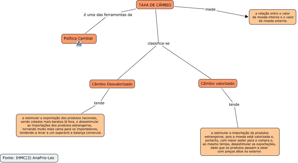 Esse mapa conceitual, produzido no IHMC CmapTools, tem a informação relacionada a: Taxa de Câmbio, TAXA DE CÂMBIO classifica-se Câmbio valorizado, TAXA DE CÂMBIO classifica-se Câmbio Desvalorizado, TAXA DE CÂMBIO mede a relação entre o valor da moeda interna e o valor da moeda externa., Câmbio Desvalorizado tende a estimular a exportação dos produtos nacionais, sendo cotados mais baratos lá fora, e desestimular as importações dos produtos estrangeiros, tornando muito mais caros para os importadores, tendendo a levar a um superávit a balança comercial., Câmbio valorizado tende a estimular a importação de produtos estrangeiros, pois a moeda está valorizada e, portanto, com maior poder para a compra e, ao mesmo tempo, desestimular as exportações, dado que os produtos passam a estar com preços altos no exterior., TAXA DE CÂMBIO é uma das ferramentas da Política Cambial