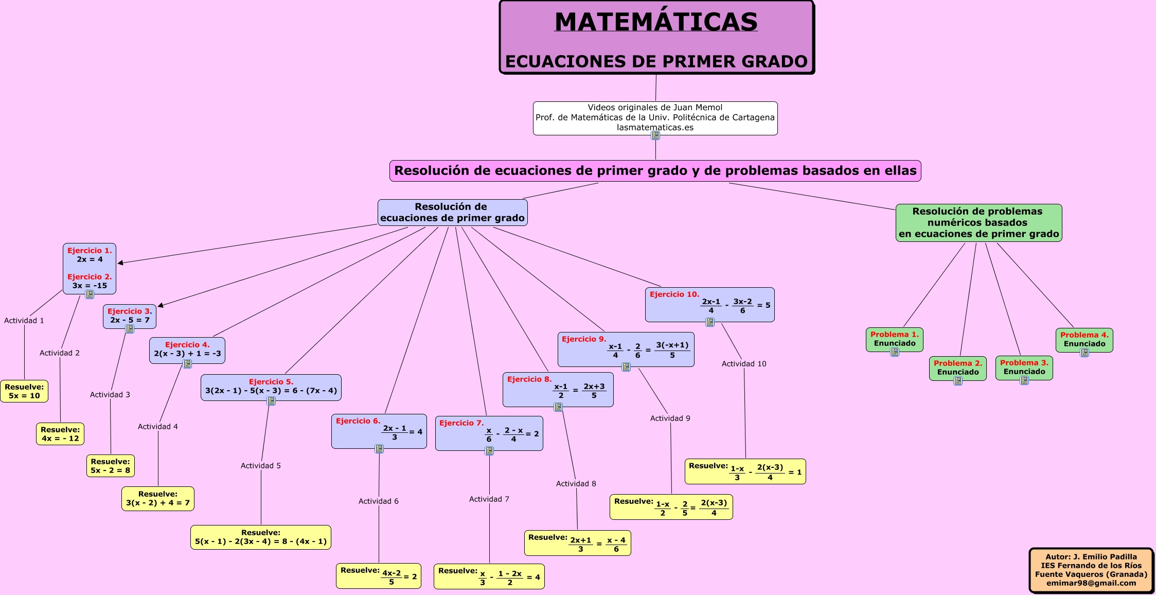 Este Cmap, tiene información relacionada con: ECUACIONES DE PRIMER GRADO, Resolución de ecuaciones de primer grado y de problemas basados en ellas Resolución de ecuaciones de primer grado <math xmlns="http://www.w3.org/1998/Math/MathML"> <mrow> <mtext> Ejercicio 9.