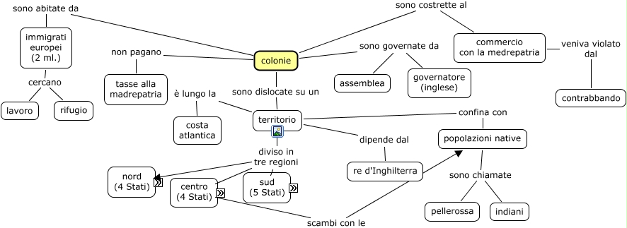 Questa Cmap, creata con IHMC CmapTools, contiene informazioni relative a: 270) Colonie americane - La situazione, nord (New England) l'economia si basa su manifatture, colonie sono abitate da immigrati europei (2 ml.), colonie sono dislocate su un territorio, colonie sono governate da governatore (inglese), territorio è lungo la costa atlantica, territorio dipende dal re d'Inghilterra, territorio diviso in tre regioni centro, sud di etnia inglese, territorio diviso in tre regioni sud, popolazioni native sono chiamate indiani, centro con un'economia commerciale, immigrati europei (2 ml.) cercano lavoro, agricola basata sulla piccola proprietà, centro è abitato da popoli del nord Europa, colonie sono governate da assemblea, agricola basata su latifondo, nord (New England) di religione puritana, commercio con la medrepatria veniva violato dal contrabbando, colonie non pagano tasse alla madrepatria, agricola che produce tabacco