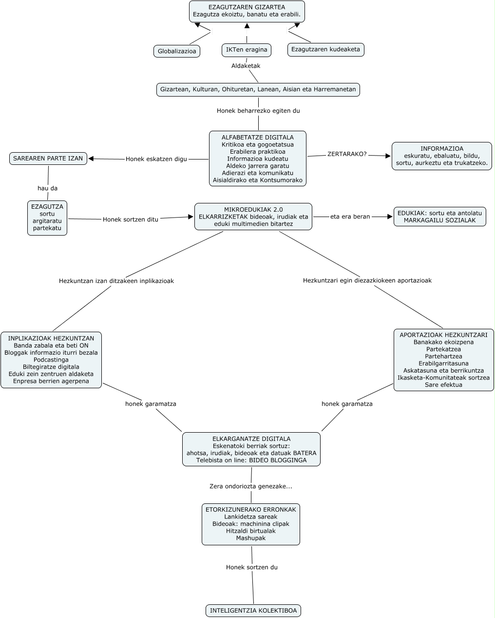 This Concept Map, created with IHMC CmapTools, has information related to: Ikasketa Prozesuaren erronka ezagutzaren gizartean, ETORKIZUNERAKO ERRONKAK Lankidetza sareak Bideoak: machinina clipak Hitzaldi birtualak Mashupak Honek sortzen du INTELIGENTZIA KOLEKTIBOA, INPLIKAZIOAK HEZKUNTZAN Banda zabala eta beti ON Bloggak informazio iturri bezala Podcastinga Biltegiratze digitala Eduki zein zentruen aldaketa Enpresa berrien agerpena honek garamatza ELKARGANATZE DIGITALA Eskenatoki berriak sortuz: ahotsa, irudiak, bideoak eta datuak BATERA Telebista on line: BIDEO BLOGGINGA, IKTen eragina Aldaketak Gizartean, Kulturan, Ohituretan, Lanean, Aisian eta Harremanetan, APORTAZIOAK HEZKUNTZARI Banakako ekoizpena Partekatzea Partehartzea Erabilgarritasuna Askatasuna eta berrikuntza Ikasketa-Komunitateak sortzea Sare efektua honek garamatza ELKARGANATZE DIGITALA Eskenatoki berriak sortuz: ahotsa, irudiak, bideoak eta datuak BATERA Telebista on line: BIDEO BLOGGINGA, ALFABETATZE DIGITALA Kritikoa eta gogoetatsua Erabilera praktikoa Informazioa kudeatu Aldeko jarrera garatu Adierazi eta komunikatu Aisialdirako eta Kontsumorako Honek eskatzen digu SAREAREN PARTE IZAN, ELKARGANATZE DIGITALA Eskenatoki berriak sortuz: ahotsa, irudiak, bideoak eta datuak BATERA Telebista on line: BIDEO BLOGGINGA Zera ondoriozta genezake... ETORKIZUNERAKO ERRONKAK Lankidetza sareak Bideoak: machinina clipak Hitzaldi birtualak Mashupak, MIKROEDUKIAK 2.0 ELKARRIZKETAK bideoak, irudiak eta eduki multimedien bitartez eta era beran EDUKIAK: sortu eta antolatu MARKAGAILU SOZIALAK, MIKROEDUKIAK 2.0 ELKARRIZKETAK bideoak, irudiak eta eduki multimedien bitartez Hezkuntzari egin diezazkiokeen aportazioak APORTAZIOAK HEZKUNTZARI Banakako ekoizpena Partekatzea Partehartzea Erabilgarritasuna Askatasuna eta berrikuntza Ikasketa-Komunitateak sortzea Sare efektua, EZAGUTZA sortu argitaratu partekatu Honek sortzen ditu MIKROEDUKIAK 2.0 ELKARRIZKETAK bideoak, irudiak eta eduki multimedien bitartez, MIKROEDUKIAK 2.0 ELKARRIZKETAK bideoak, irudiak eta eduki multimedien bitartez Hezkuntzan izan ditzakeen inplikazioak INPLIKAZIOAK HEZKUNTZAN Banda zabala eta beti ON Bloggak informazio iturri bezala Podcastinga Biltegiratze digitala Eduki zein zentruen aldaketa Enpresa berrien agerpena, Globalizazioa EZAGUTZAREN GIZARTEA Ezagutza ekoiztu, banatu eta erabili., Gizartean, Kulturan, Ohituretan, Lanean, Aisian eta Harremanetan Honek beharrezko egiten du ALFABETATZE DIGITALA Kritikoa eta gogoetatsua Erabilera praktikoa Informazioa kudeatu Aldeko jarrera garatu Adierazi eta komunikatu Aisialdirako eta Kontsumorako, IKTen eragina EZAGUTZAREN GIZARTEA Ezagutza ekoiztu, banatu eta erabili., ALFABETATZE DIGITALA Kritikoa eta gogoetatsua Erabilera praktikoa Informazioa kudeatu Aldeko jarrera garatu Adierazi eta komunikatu Aisialdirako eta Kontsumorako ZERTARAKO? INFORMAZIOA eskuratu, ebaluatu, bildu, sortu, aurkeztu eta trukatzeko., SAREAREN PARTE IZAN hau da EZAGUTZA sortu argitaratu partekatu, Ezagutzaren kudeaketa EZAGUTZAREN GIZARTEA Ezagutza ekoiztu, banatu eta erabili.
