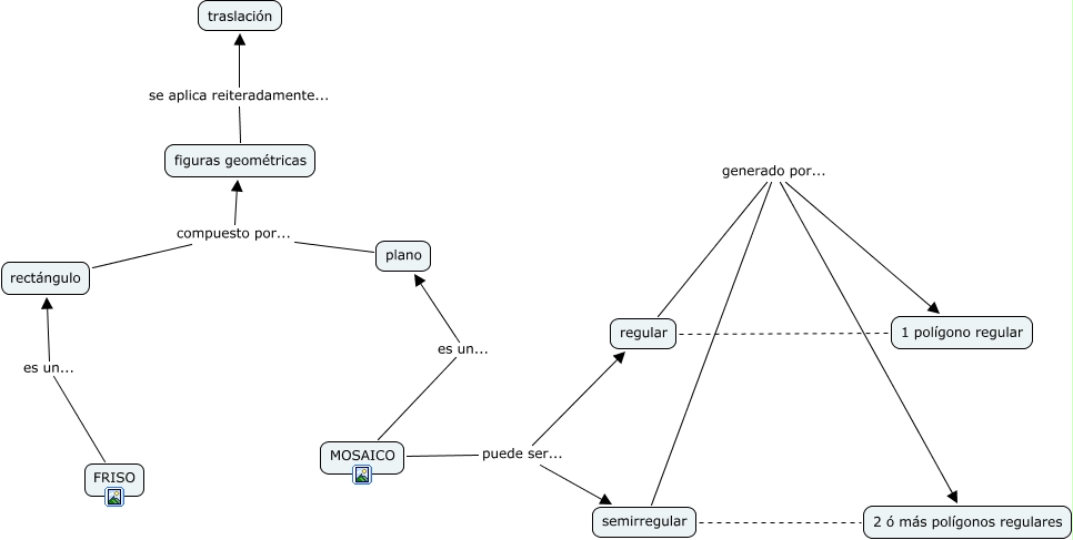 Este Cmap, tiene información relacionada con: Frisos y mosaicos, regular 1 polígono regular, figuras geométricas se aplica reiteradamente... traslación, semirregular generado por... 1 polígono regular, regular generado por... 1 polígono regular, FRISO es un... rectángulo, MOSAICO es un... plano, regular generado por... 2 ó más polígonos regulares, MOSAICO puede ser... semirregular, semirregular generado por... 2 ó más polígonos regulares, rectángulo compuesto por... figuras geométricas, plano compuesto por... figuras geométricas, MOSAICO puede ser... regular, semirregular 2 ó más polígonos regulares