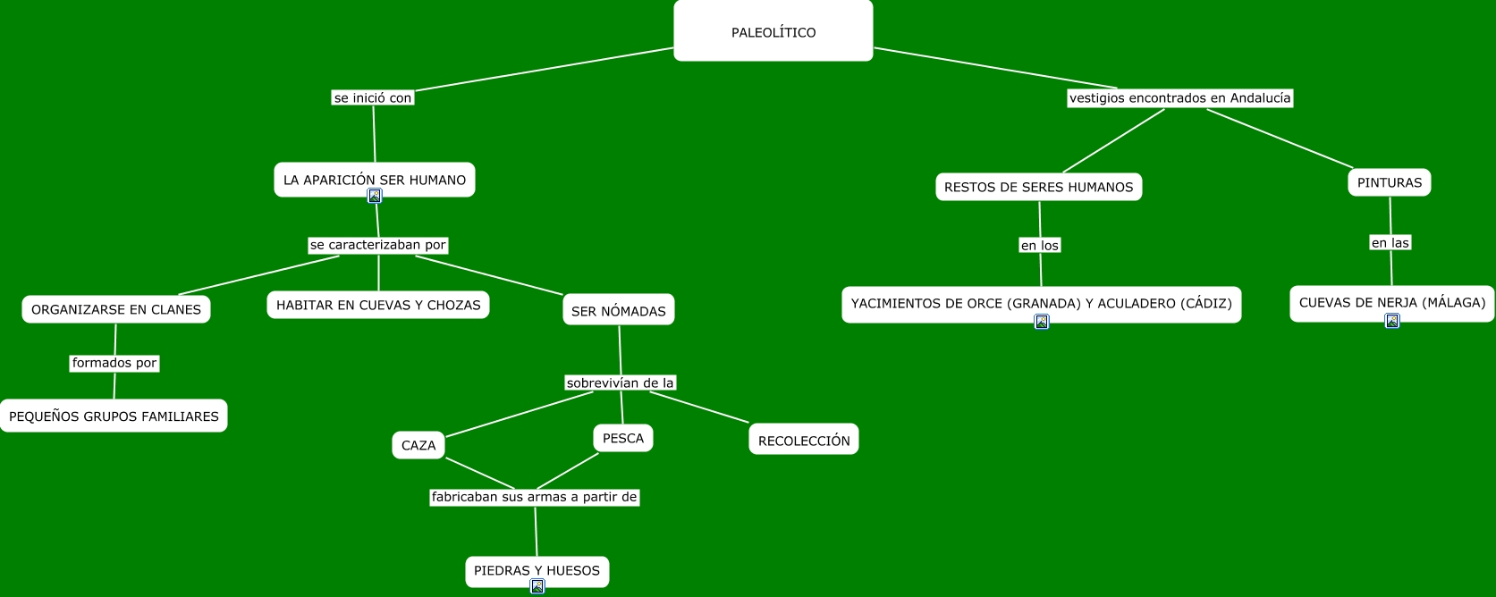 Este Cmap, tiene información relacionada con: paleolitico, ORGANIZARSE EN CLANES formados por PEQUEÑOS GRUPOS FAMILIARES, SER NÓMADAS sobrevivían de la RECOLECCIÓN, PALEOLÍTICO vestigios encontrados en Andalucía PINTURAS, PESCA fabricaban sus armas a partir de PIEDRAS Y HUESOS, LA APARICIÓN SER HUMANO se caracterizaban por HABITAR EN CUEVAS Y CHOZAS, LA APARICIÓN SER HUMANO se caracterizaban por SER NÓMADAS, RESTOS DE SERES HUMANOS en los YACIMIENTOS DE ORCE (GRANADA) Y ACULADERO (CÁDIZ), LA APARICIÓN SER HUMANO se caracterizaban por ORGANIZARSE EN CLANES, PALEOLÍTICO se inició con LA APARICIÓN SER HUMANO, CAZA fabricaban sus armas a partir de PIEDRAS Y HUESOS, PINTURAS en las CUEVAS DE NERJA (MÁLAGA), PALEOLÍTICO vestigios encontrados en Andalucía RESTOS DE SERES HUMANOS, SER NÓMADAS sobrevivían de la CAZA, SER NÓMADAS sobrevivían de la PESCA