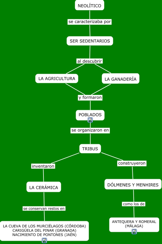 Este Cmap, tiene información relacionada con: neolitico, TRIBUS inventaron LA CERÁMICA, LA AGRICULTURA y formaron POBLADOS, TRIBUS construyeron DÓLMENES Y MENHIRES, DÓLMENES Y MENHIRES como los de ANTEQUERA Y ROMERAL (MÁLAGA), LA GANADERÍA y formaron POBLADOS, NEOLÍTICO se caracterizaba por SER SEDENTARIOS, LA CERÁMICA se conservan restos en LA CUEVA DE LOS MURCIÉLAGOS (CÓRDOBA) CARIGÜELA DEL PINAR (GRANADA) NACIMIENTO DE PONTONES (JAÉN), SER SEDENTARIOS al descubrir LA GANADERÍA, SER SEDENTARIOS al descubrir LA AGRICULTURA, POBLADOS se organizaron en TRIBUS