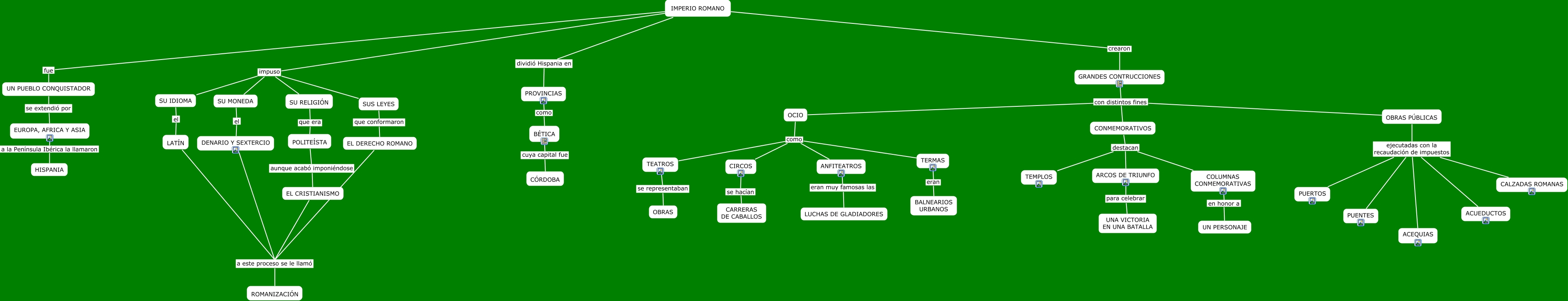 Este Cmap, tiene información relacionada con: imperio romano, ANFITEATROS eran muy famosas las LUCHAS DE GLADIADORES, COLUMNAS CONMEMORATIVAS en honor a UN PERSONAJE, OCIO como TEATROS, CONMEMORATIVOS destacan ARCOS DE TRIUNFO, SU IDIOMA el LATÍN, OBRAS PÚBLICAS ejecutadas con la recaudación de impuestos PUENTES, POLITEÍSTA aunque acabó imponiéndose EL CRISTIANISMO, EL CRISTIANISMO a este proceso se le llamó ROMANIZACIÓN, GRANDES CONTRUCCIONES con distintos fines CONMEMORATIVOS, LATÍN a este proceso se le llamó ROMANIZACIÓN, CIRCOS se hacían CARRERAS DE CABALLOS, DENARIO Y SEXTERCIO a este proceso se le llamó ROMANIZACIÓN, OBRAS PÚBLICAS ejecutadas con la recaudación de impuestos CALZADAS ROMANAS, BÉTICA cuya capital fue CÓRDOBA, OBRAS PÚBLICAS ejecutadas con la recaudación de impuestos PUERTOS, TEATROS se representaban OBRAS, IMPERIO ROMANO impuso SU MONEDA, GRANDES CONTRUCCIONES con distintos fines OBRAS PÚBLICAS, PROVINCIAS como BÉTICA, OBRAS PÚBLICAS ejecutadas con la recaudación de impuestos ACUEDUCTOS