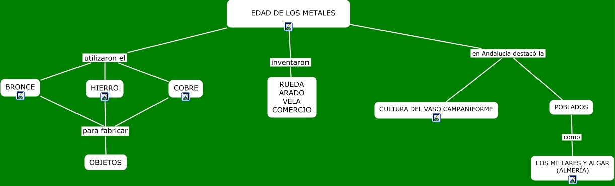 Este Cmap, tiene información relacionada con: edad de los metales, COBRE para fabricar OBJETOS, EDAD DE LOS METALES en Andalucía destacó la CULTURA DEL VASO CAMPANIFORME, EDAD DE LOS METALES utilizaron el COBRE, POBLADOS como LOS MILLARES Y ALGAR (ALMERÍA), HIERRO para fabricar OBJETOS, EDAD DE LOS METALES utilizaron el HIERRO, EDAD DE LOS METALES inventaron RUEDA ARADO VELA COMERCIO, EDAD DE LOS METALES en Andalucía destacó la POBLADOS, BRONCE para fabricar OBJETOS, EDAD DE LOS METALES utilizaron el BRONCE