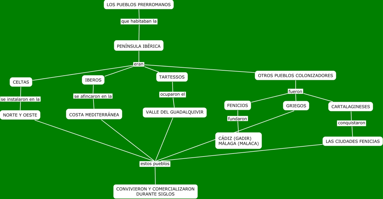 Este Cmap, tiene información relacionada con: pueblos prerromanos, COSTA MEDITERRÁNEA estos pueblos CONVIVIERON Y COMERCIALIZARON DURANTE SIGLOS, PENÍNSULA IBÉRICA eran OTROS PUEBLOS COLONIZADORES, VALLE DEL GUADALQUIVIR estos pueblos CONVIVIERON Y COMERCIALIZARON DURANTE SIGLOS, LAS CIUDADES FENICIAS estos pueblos CONVIVIERON Y COMERCIALIZARON DURANTE SIGLOS, PENÍNSULA IBÉRICA eran TARTESSOS, IBEROS se afincaron en la COSTA MEDITERRÁNEA, LOS PUEBLOS PRERROMANOS que habitaban la PENÍNSULA IBÉRICA, CELTAS se instalaron en la NORTE Y OESTE, OTROS PUEBLOS COLONIZADORES fueron FENICIOS, NORTE Y OESTE estos pueblos CONVIVIERON Y COMERCIALIZARON DURANTE SIGLOS, PENÍNSULA IBÉRICA eran IBEROS, CARTALAGINESES conquistaron LAS CIUDADES FENICIAS, GRIEGOS estos pueblos CONVIVIERON Y COMERCIALIZARON DURANTE SIGLOS, OTROS PUEBLOS COLONIZADORES fueron CARTALAGINESES, PENÍNSULA IBÉRICA eran CELTAS, TARTESSOS ocuparon el VALLE DEL GUADALQUIVIR, OTROS PUEBLOS COLONIZADORES fueron GRIEGOS, FENICIOS fundaron CÁDIZ (GADIR) MÁLAGA (MALACA)
