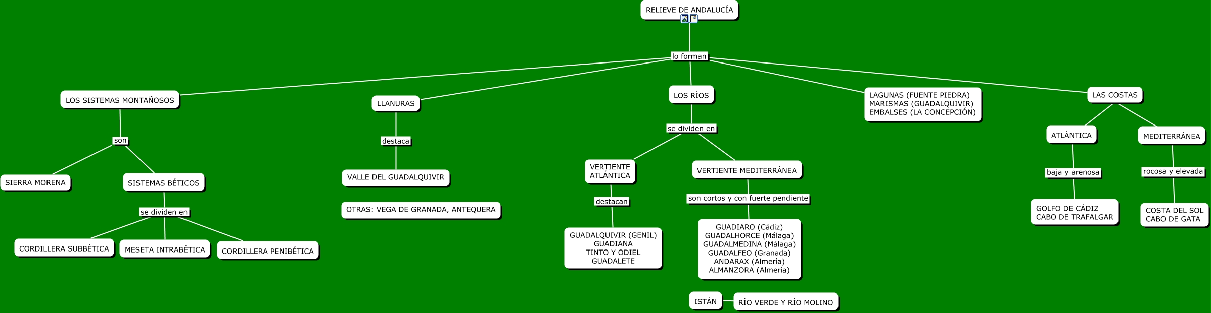 Este Cmap, tiene información relacionada con: relieve, RELIEVE DE ANDALUCÍA lo forman LAS COSTAS, LAS COSTAS ???? ATLÁNTICA, SISTEMAS BÉTICOS se dividen en CORDILLERA SUBBÉTICA, LOS SISTEMAS MONTAÑOSOS son SISTEMAS BÉTICOS, LLANURAS destaca VALLE DEL GUADALQUIVIR, LAS COSTAS ???? MEDITERRÁNEA, VERTIENTE ATLÁNTICA destacan GUADALQUIVIR (GENIL) GUADIANA TINTO Y ODIEL GUADALETE, LOS SISTEMAS MONTAÑOSOS son SIERRA MORENA, SISTEMAS BÉTICOS se dividen en MESETA INTRABÉTICA, SISTEMAS BÉTICOS se dividen en CORDILLERA PENIBÉTICA, ATLÁNTICA baja y arenosa GOLFO DE CÁDIZ CABO DE TRAFALGAR, VERTIENTE MEDITERRÁNEA son cortos y con fuerte pendiente GUADIARO (Cádiz) GUADALHORCE (Málaga) GUADALMEDINA (Málaga) GUADALFEO (Granada) ANDARAX (Almería) ALMANZORA (Almería), RELIEVE DE ANDALUCÍA lo forman LLANURAS, LOS RÍOS se dividen en VERTIENTE MEDITERRÁNEA, RELIEVE DE ANDALUCÍA lo forman LOS RÍOS, RELIEVE DE ANDALUCÍA lo forman LAGUNAS (FUENTE PIEDRA) MARISMAS (GUADALQUIVIR) EMBALSES (LA CONCEPCIÓN), LOS RÍOS se dividen en VERTIENTE ATLÁNTICA, RELIEVE DE ANDALUCÍA lo forman LOS SISTEMAS MONTAÑOSOS, ISTÁN ???? RÍO VERDE Y RÍO MOLINO, MEDITERRÁNEA rocosa y elevada COSTA DEL SOL CABO DE GATA