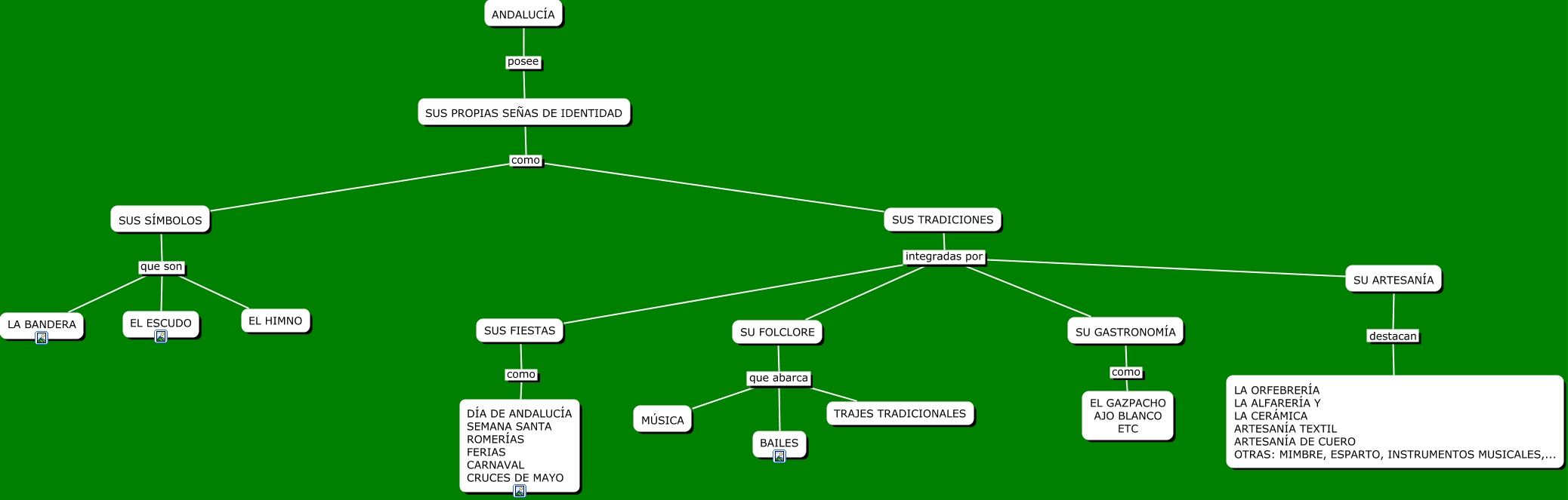 Este Cmap, tiene información relacionada con: tradiciones, SU FOLCLORE que abarca BAILES, ANDALUCÍA posee SUS PROPIAS SEÑAS DE IDENTIDAD, SUS TRADICIONES integradas por SU FOLCLORE, SU GASTRONOMÍA como EL GAZPACHO AJO BLANCO ETC, SUS SÍMBOLOS que son EL HIMNO, SUS SÍMBOLOS que son EL ESCUDO, SU ARTESANÍA destacan LA ORFEBRERÍA LA ALFARERÍA Y LA CERÁMICA ARTESANÍA TEXTIL ARTESANÍA DE CUERO OTRAS: MIMBRE, ESPARTO, INSTRUMENTOS MUSICALES,..., SUS TRADICIONES integradas por SUS FIESTAS, SUS SÍMBOLOS que son LA BANDERA, SUS TRADICIONES integradas por SU ARTESANÍA, SUS PROPIAS SEÑAS DE IDENTIDAD como SUS SÍMBOLOS, SUS PROPIAS SEÑAS DE IDENTIDAD como SUS TRADICIONES, SUS FIESTAS como DÍA DE ANDALUCÍA SEMANA SANTA ROMERÍAS FERIAS CARNAVAL CRUCES DE MAYO, SU FOLCLORE que abarca TRAJES TRADICIONALES, SU FOLCLORE que abarca MÚSICA, SUS TRADICIONES integradas por SU GASTRONOMÍA