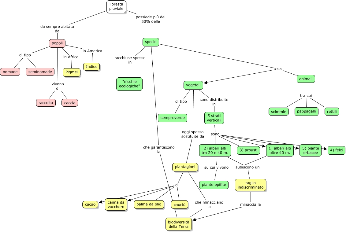 Questa Cmap, creata con IHMC CmapTools, contiene informazioni relative a: 322 Ambienti - Foresta pluviale, piantagioni di palma da olio, piantagioni di cacao, animali tra cui scimmie, piantagioni di cauciù, popoli vivono di caccia, 1) alberi alti oltre 40 m. subiscono un taglio indiscriminato, popoli di tipo seminomade, 5 strati verticali sono 5) piante erbacee, popoli vivono di raccolta, piantagioni che minacciano la biodiversità della Terra, Foresta pluviale da sempre abitata da popoli, 5 strati verticali sono 4) felci, 5 strati verticali sono 2) alberi alti tra 20 e 40 m., 2) alberi alti tra 20 e 40 m. subiscono un taglio indiscriminato, vegetali oggi spesso sostituite da piantagioni, 5 strati verticali sono 1) alberi alti oltre 40 m., specie che garantiscono la biodiversità della Terra, Foresta pluviale possiede più del 50% delle specie, taglio indiscriminato minaccia la biodiversità della Terra, popoli in America Indios