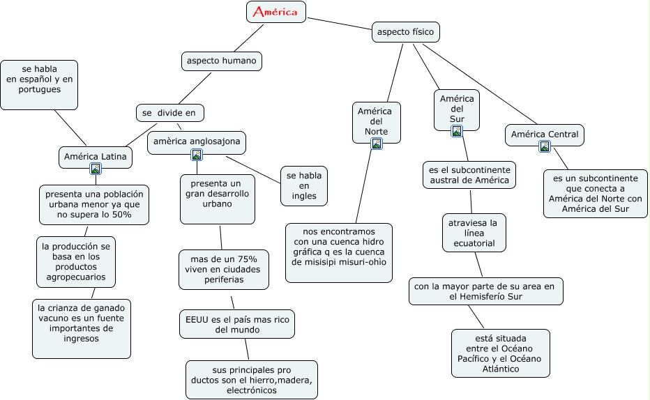 Este Cmap, tiene información relacionada con: diferentes americas, aspecto humano ???? se divide en, América Latina ???? se habla en español y en portugues, América Central ???? es un subcontinente que conecta a América del Norte con América del Sur, presenta un gran desarrollo urbano ???? mas de un 75% viven en ciudades periferias, aspecto físico América Central, América Latina ???? presenta una población urbana menor ya que no supera lo 50%, se divide en ???? América Latina, la producción se basa en los productos agropecuarios ???? la crianza de ganado vacuno es un fuente importantes de ingresos, América aspecto físico, con la mayor parte de su area en el Hemisferío Sur ???? está situada entre el Océano Pacífico y el Océano Atlántico, aspecto físico América del Norte, amèrica anglosajona ???? se habla en ingles, es el subcontinente austral de América ???? atraviesa la línea ecuatorial, atraviesa la línea ecuatorial ???? con la mayor parte de su area en el Hemisferío Sur, EEUU es el país mas rico del mundo ???? sus principales pro ductos son el hierro,madera, electrónicos, se divide en amèrica anglosajona, aspecto físico América del Sur, América ???? aspecto humano, mas de un 75% viven en ciudades periferias EEUU es el país mas rico del mundo, amèrica anglosajona ???? presenta un gran desarrollo urbano