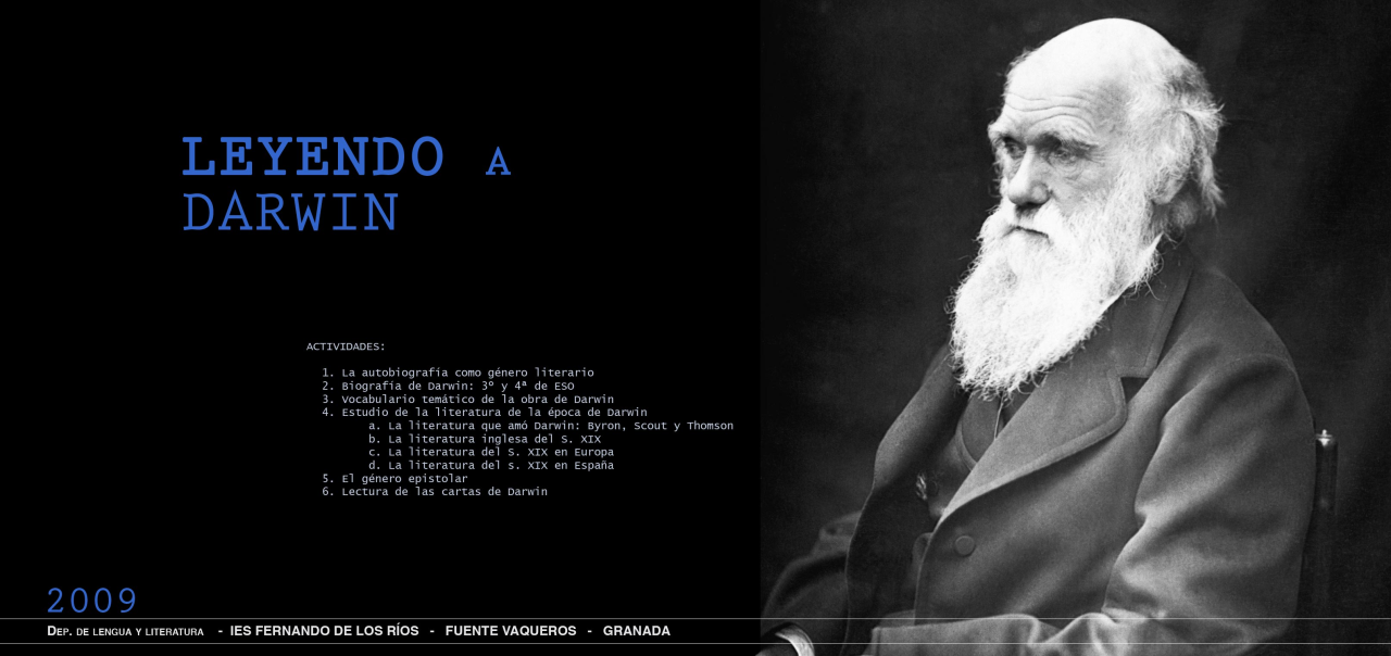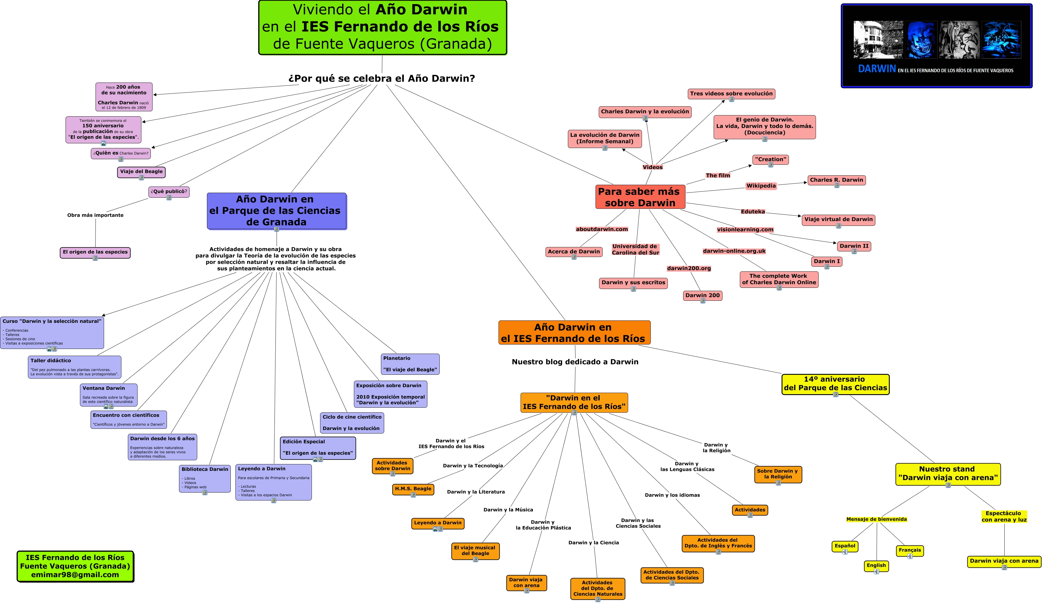 Este Cmap, tiene información relacionada con: AÑO DARWIN, Para saber más sobre Darwin Videos Tres videos sobre evolución, Año Darwin en el Parque de las Ciencias de Granada Actividades de homenaje a Darwin y su obra para divulgar la Teoría de la evolución de las especies por selección natural y resaltar la influencia de sus planteamientos en la ciencia actual. Darwin desde los 6 años Experiencias sobre naturaleza y adaptación de los seres vivos a diferentes medios., Viviendo el Año Darwin en el IES Fernando de los Ríos de Fuente Vaqueros (Granada) ¿Por qué se celebra el Año Darwin? Año Darwin en el IES Fernando de los Ríos, Para saber más sobre Darwin Videos El genio de Darwin. La vida, Darwin y todo lo demás. (Docuciencia), Para saber más sobre Darwin Videos La evolución de Darwin (Informe Semanal), Viviendo el Año Darwin en el IES Fernando de los Ríos de Fuente Vaqueros (Granada) ¿Por qué se celebra el Año Darwin? Hace 200 años de su nacimiento Charles Darwin nació el 12 de febrero de 1809, Para saber más sobre Darwin visionlearning.com Darwin I, Año Darwin en el Parque de las Ciencias de Granada Actividades de homenaje a Darwin y su obra para divulgar la Teoría de la evolución de las especies por selección natural y resaltar la influencia de sus planteamientos en la ciencia actual. Exposición sobre Darwin 2010 Exposición temporal "Darwin y la evolución", Nuestro stand "Darwin viaja con arena" Mensaje de bienvenida Español, "Darwin en el IES Fernando de los Ríos" Darwin y los idiomas Actividades del Dpto. de Inglés y Francés, "Darwin en el IES Fernando de los Ríos" Darwin y la Educación Plástica Darwin viaja con arena, "Darwin en el IES Fernando de los Ríos" Darwin y la Tecnología H.M.S. Beagle, Para saber más sobre Darwin The film "Creation", Año Darwin en el Parque de las Ciencias de Granada Actividades de homenaje a Darwin y su obra para divulgar la Teoría de la evolución de las especies por selección natural y resaltar la influencia de sus planteamientos en la ciencia actual. Leyendo a Darwin Para escolares de Primaria y Secundaria - Lecturas - Talleres - Visitas a los espacios Darwin, Nuestro stand "Darwin viaja con arena" Mensaje de bienvenida Français, Año Darwin en el Parque de las Ciencias de Granada Actividades de homenaje a Darwin y su obra para divulgar la Teoría de la evolución de las especies por selección natural y resaltar la influencia de sus planteamientos en la ciencia actual. Ventana Darwin Sala recreada sobre la figura de este científico naturalista, Nuestro stand "Darwin viaja con arena" Mensaje de bienvenida English, Viviendo el Año Darwin en el IES Fernando de los Ríos de Fuente Vaqueros (Granada) ¿Por qué se celebra el Año Darwin? Año Darwin en el Parque de las Ciencias de Granada, Año Darwin en el IES Fernando de los Ríos 14º aniversario del Parque de las Ciencias Nuestro stand "Darwin viaja con arena", ¿Qué publicó? Obra más importante El origen de las especies