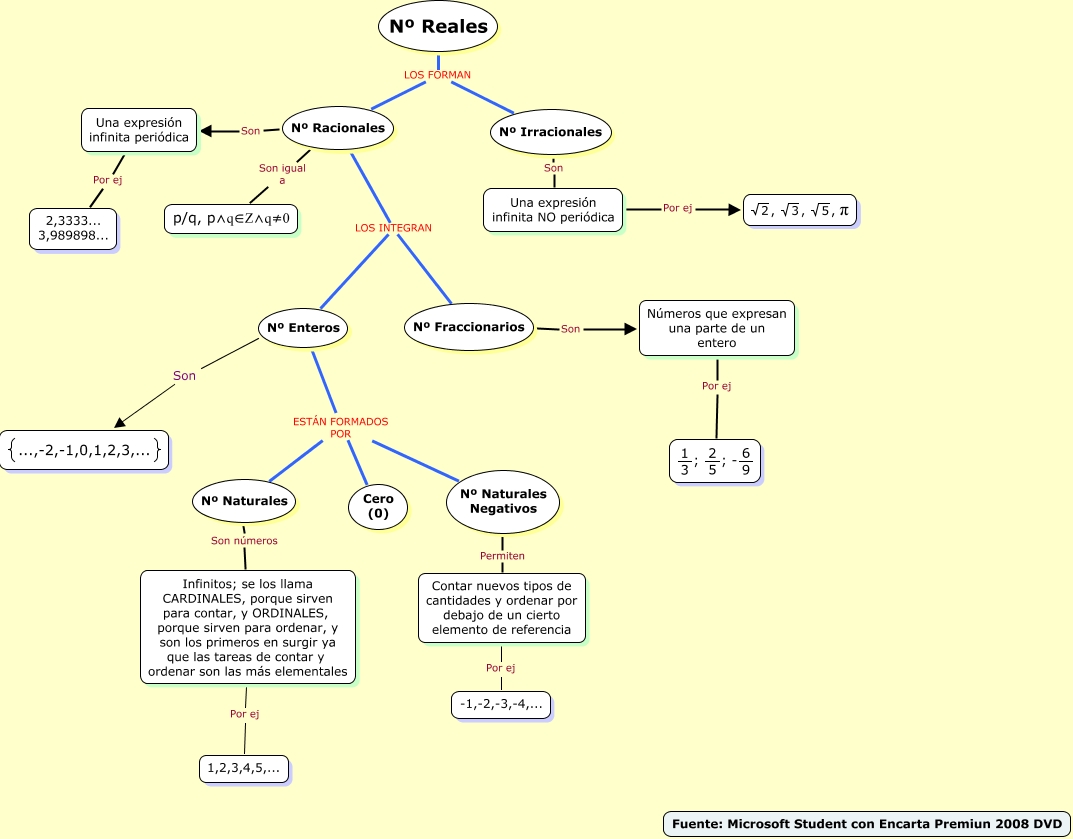 Este mapa conceptual tiene información relacionada a: Números reales-Rocío, Nº Naturales Son números Infinitos; se los llama CARDINALES, porque sirven para contar, y ORDINALES, porque sirven para ordenar, y son los primeros en surgir ya que las tareas de contar y ordenar son las más elementales, Nº Racionales Son igual a p/q, p∧q∈Ζ∧q≠0, Nº Enteros Son <math xmlns="http://www.w3.org/1998/Math/MathML"> <mrow> <mfenced open="{" close=""> <mtext> </mtext> </mfenced> <mtext> ...,-2,-1,0,1,2,3,... </mtext> <mfenced open="" close="}"> <mtext> </mtext> </mfenced> </mrow> </math>, Nº Irracionales Son Una expresión infinita NO periódica, Nº Fraccionarios Son Números que expresan una parte de un entero, Nº Racionales Son Una expresión infinita periódica, Nº Racionales LOS INTEGRAN Nº Fraccionarios, Nº Reales LOS FORMAN Nº Racionales, Números que expresan una parte de un entero Por ej <math xmlns="http://www.w3.org/1998/Math/MathML"> <mrow> <mfrac> <mtext> 1 </mtext> <mtext> 3 </mtext> </mfrac> <mtext> ; </mtext> <mfrac> <mtext> 2 </mtext> <mtext> 5 </mtext> </mfrac> <mtext> ; - </mtext> <mfrac> <mtext> 6 </mtext> <mtext> 9 </mtext> </mfrac> </mrow> </math>, Nº Racionales LOS INTEGRAN Nº Enteros