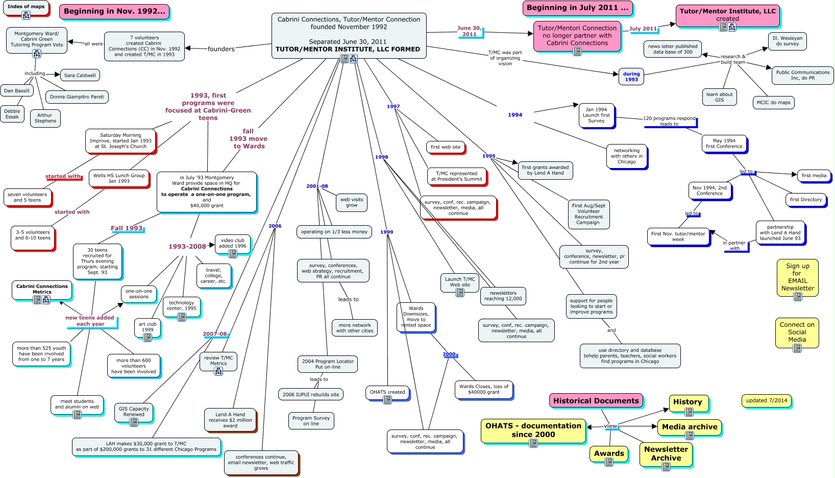 This Concept Map, created with IHMC CmapTools, has information related to: Cabrini Connections and TMC timeline, in July '93 Montgomery Ward provide space in HQ for Cabrini Connections to operate a one-on-one program, and $40,000 grant 1993-2008 technology center, 1995, Nov 1994, 2nd Conference led to First Nov. tutor/mentor week, Jan 1994 Launch first Survey 120 programs respond leads to May 1994 first Conference, Cabrini Connections, Tutor/Mentor Connection founded November 1992 Separated June 30, 2011 TUTOR/MENTOR INSTITUTE, LLC FORMED 2006 Lend A Hand receives $2 million award, 2004 Program Locator Put on-line leads to Program Survey on line, Cabrini Connections, Tutor/Mentor Connection founded November 1992 Separated June 30, 2011 TUTOR/MENTOR INSTITUTE, LLC FORMED 1995 survey, conference, newsletter, pr continue for 2nd year, 30 teens recruited for Thurs evening program, starting Sept. 93 new teens added each year more than 600 volunteers have been involved, Cabrini Connections, Tutor/Mentor Connection founded November 1992 Separated June 30, 2011 TUTOR/MENTOR INSTITUTE, LLC FORMED 2007-08 LAH makes $30,000 grant to T/MC as part of $200,000 grants to 31 different Chicago Programs, in July '93 Montgomery Ward provide space in HQ for Cabrini Connections to operate a one-on-one program, and $40,000 grant Fall 1993 30 teens recruited for Thurs evening program, starting Sept. 93, 30 teens recruited for Thurs evening program, starting Sept. 93 new teens added each year meet students and alumni on web, Cabrini Connections, Tutor/Mentor Connection founded November 1992 Separated June 30, 2011 TUTOR/MENTOR INSTITUTE, LLC FORMED 1995 support for people looking to start or improve programs, Cabrini Connections, Tutor/Mentor Connection founded November 1992 Separated June 30, 2011 TUTOR/MENTOR INSTITUTE, LLC FORMED 1999 OHATS created, Cabrini Connections, Tutor/Mentor Connection founded November 1992 Separated June 30, 2011 TUTOR/MENTOR INSTITUTE, LLC FORMED fall 1993 move to Wards in July '93 Montgomery Ward provide space in HQ for Cabrini Connections to operate a one-on-one program, and $40,000 grant, Cabrini Connections, Tutor/Mentor Connection founded November 1992 Separated June 30, 2011 TUTOR/MENTOR INSTITUTE, LLC FORMED 1998 Launch T/MC Web site, Cabrini Connections, Tutor/Mentor Connection founded November 1992 Separated June 30, 2011 TUTOR/MENTOR INSTITUTE, LLC FORMED 2001-08 survey, conferences, web strategy, recruitment, PR all continue, Wards Downsizes, move to rented space 2000 survey, conf, rec. campaign, newsletter, media, all continue, Cabrini Connections, Tutor/Mentor Connection founded November 1992 Separated June 30, 2011 TUTOR/MENTOR INSTITUTE, LLC FORMED 1993, first programs were focused at Cabrini-Green teens Wells HS Lunch Group Jan 1993, during 1993 research & build team MCIC do maps, Cabrini Connections, Tutor/Mentor Connection founded November 1992 Separated June 30, 2011 TUTOR/MENTOR INSTITUTE, LLC FORMED 1997 first web site, in July '93 Montgomery Ward provide space in HQ for Cabrini Connections to operate a one-on-one program, and $40,000 grant 1993-2008 video club added 1996