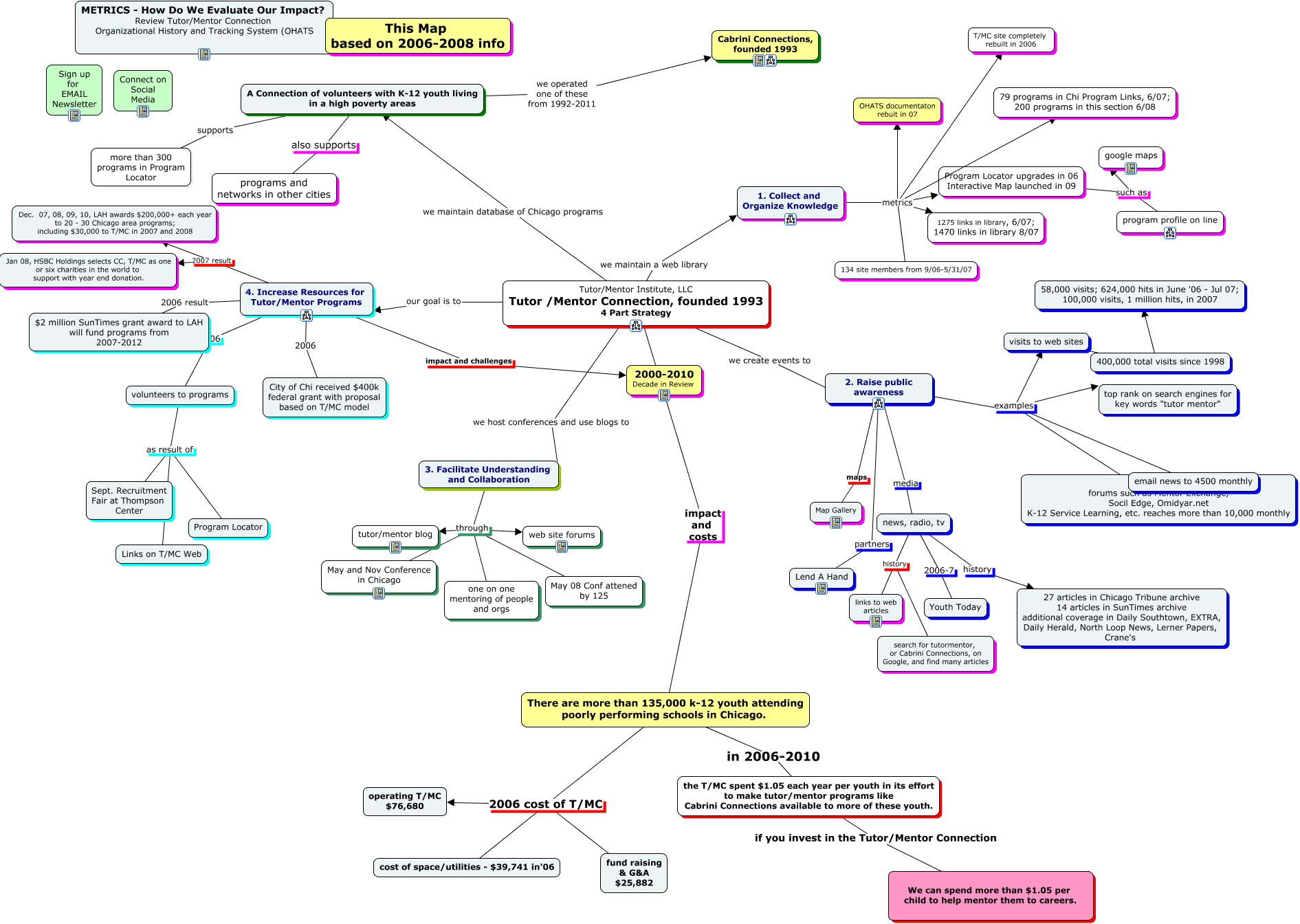 This Concept Map, created with IHMC CmapTools, has information related to: metrics, 4. Increase Resources for Tutor/Mentor Programs impact and challenges 2000-2010 Decade in Review, 1. Collect and Organize Knowledge metrics 79 programs in Chi Program Links, 6/07; 200 programs in this section 6/08, news, radio, tv 2006-7 Youth Today, Program Locator upgrades in 06 Interactive Map launched in 09 such as google maps, 4. Increase Resources for Tutor/Mentor Programs 2007 result Dec. 07, 08, 09, 10, LAH awards $200,000+ each year to 20 - 30 Chicago area programs; including $30,000 to T/MC in 2007 and 2008, 3. Facilitate Understanding and Collaboration through May 08 Conf attened by 125, A Connection of volunteers with K-12 youth living in a high poverty areas also supports programs and networks in other cities, 2. Raise public awareness partners Lend A Hand, 1. Collect and Organize Knowledge metrics 1275 links in library, 6/07; 1470 links in library 8/07, There are more than 135,000 k-12 youth attending poorly performing schools in Chicago. 2006 cost of T/MC operating T/MC $76,680, news, radio, tv history links to web articles, visits to web sites traffic 400,000 total visits since 1998, 1. Collect and Organize Knowledge metrics 134 site members from 9/06-5/31/07, 2. Raise public awareness examples visits to web sites, 3. Facilitate Understanding and Collaboration through tutor/mentor blog, Tutor/Mentor Institute, LLC Tutor /Mentor Connection, founded 1993 4 Part Strategy we maintain database of Chicago programs A Connection of volunteers with K-12 youth living in a high poverty areas, news, radio, tv history search for tutormentor, or Cabrini Connections, on Google, and find many articles, Program Locator upgrades in 06 Interactive Map launched in 09 such as program profile on line, 1. Collect and Organize Knowledge metrics OHATS documentaton rebuit in 07, There are more than 135,000 k-12 youth attending poorly performing schools in Chicago. 2006 cost of T/MC fund raising & G&A $25,882