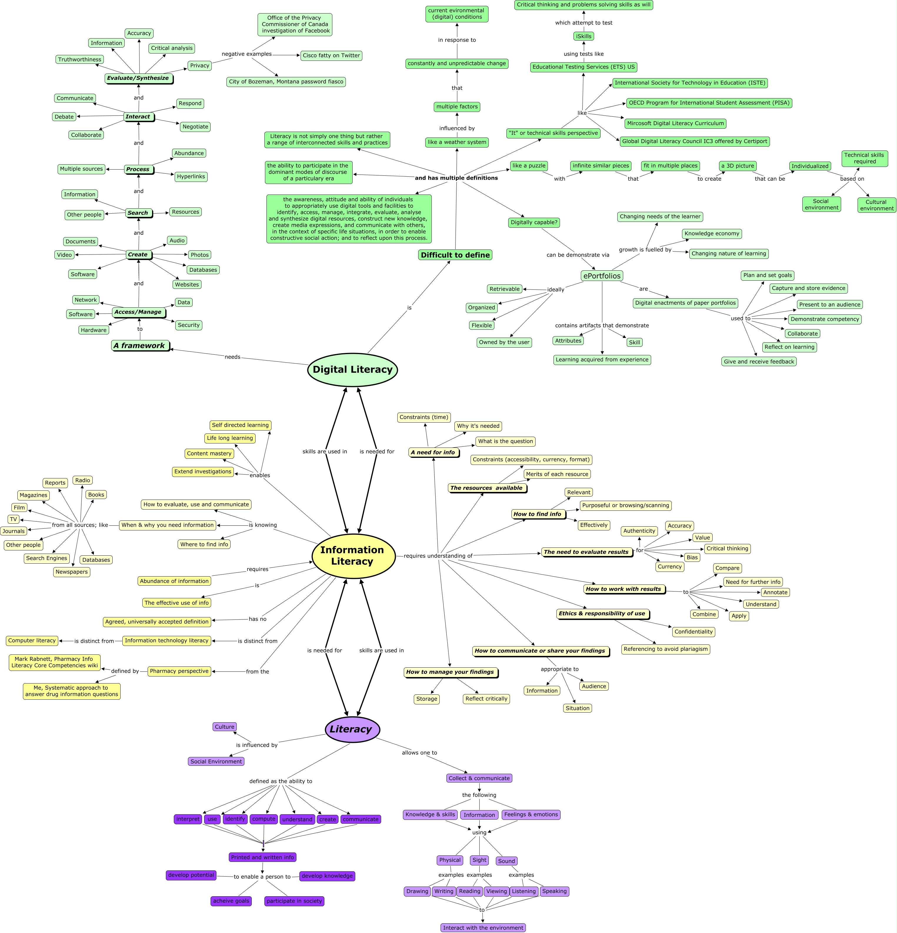 This Concept Map, created with IHMC CmapTools, has information related to: Digital Literacy July 2009, Search for Information, ePortfolios growth is fuelled by Changing needs of the learner, The resources available Constraints (accessibility, currency, format), When & why you need information from all sources; like Journals, Feelings & emotions using Sound, Evaluate/Synthesize ???? Accuracy, Information Literacy from the Pharmacy perspective, Abundance of information requires Information Literacy, Interact ???? Negotiate, "It" or technical skills perspective like Mircosoft Digital Literacy Curriculum, When & why you need information from all sources; like TV, Individualized based on Cultural environment, Digital enactments of paper portfolios used to Demonstrate competency, Feelings & emotions using Sight, The need to evaluate results for Value, multiple factors that constantly and unpredictable change, Access/Manage and Create, Information Literacy enables Extend investigations, "It" or technical skills perspective like OECD Program for International Student Assessment (PISA), The resources available Merits of each resource