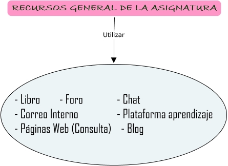 Este Cmap, tiene información relacionada con: Recursos Generales, RECURSOS GENERAL DE LA ASIGNATURA Utilizar - Libro - Foro - Chat - Correo Interno - Plataforma aprendizaje - Páginas Web (Consulta) - Blog