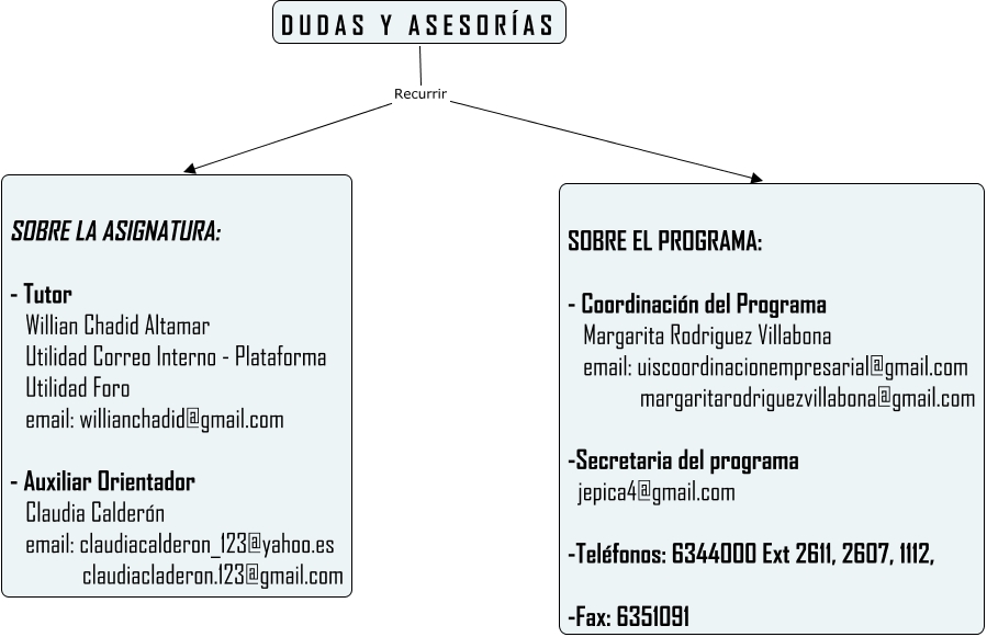 Este Cmap, tiene información relacionada con: Asesoria, D U D A S Y A S E S O R Í A S Recurrir SOBRE EL PROGRAMA: - Coordinación del Programa Margarita Rodriguez Villabona email: uiscoordinacionempresarial@gmail.com margaritarodriguezvillabona@gmail.com -Secretaria del programa jepica4@gmail.com -Teléfonos: 6344000 Ext 2611, 2607, 1112, -Fax: 6351091, D U D A S Y A S E S O R Í A S Recurrir SOBRE LA ASIGNATURA: - Tutor Willian Chadid Altamar Utilidad Correo Interno - Plataforma Utilidad Foro email: willianchadid@gmail.com - Auxiliar Orientador Claudia Calderón email: claudiacalderon_123@yahoo.es claudiacladeron.123@gmail.com
