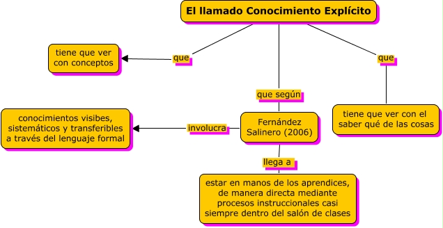 Este Cmap, tiene información relacionada con: conocimiento explícito.f1, El llamado Conocimiento Explícito que tiene que ver con conceptos, El llamado Conocimiento Explícito que tiene que ver con el saber qué de las cosas, El llamado Conocimiento Explícito que según Fernández Salinero (2006), Fernández Salinero (2006) llega a estar en manos de los aprendices, de manera directa mediante procesos instruccionales casi siempre dentro del salón de clases, Fernández Salinero (2006) involucra conocimientos visibes, sistemáticos y transferibles a través del lenguaje formal