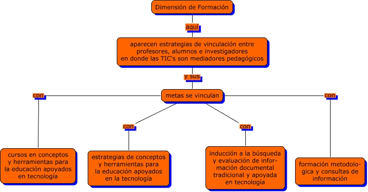 Este Cmap, tiene información relacionada con: dimension3.f3, metas se vinculan con cursos en conceptos y herramientas para la educación apoyados en tecnología, Dimensión de Formación aquí aparecen estrategias de vinculación entre profesores, alumnos e investigadores en donde las TIC's son mediadores pedagógicos, metas se vinculan con inducción a la búsqueda y evaluación de infor- mación documental tradicional y apoyada en tecnología, aparecen estrategias de vinculación entre profesores, alumnos e investigadores en donde las TIC's son mediadores pedagógicos y sus metas se vinculan, metas se vinculan con formación metodolo- gica y consultas de información, metas se vinculan con estrategias de conceptos y herramientas para la educación apoyados en la tecnología