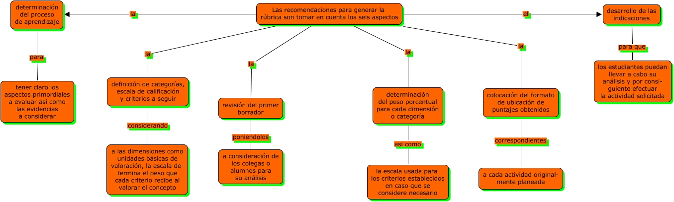 Este Cmap, tiene información relacionada con: recom. para generar rubrica.f5, revisión del primer borrador poniendolos a consideración de los colegas o alumnos para su análisis, Las recomendaciones para generar la rúbrica son tomar en cuenta los seis aspectos la definición de categorías, escala de calificación y criterios a seguir, Las recomendaciones para generar la rúbrica son tomar en cuenta los seis aspectos la determinación del proceso de aprendizaje, colocación del formato de ubicación de puntajes obtenidos correspondientes a cada actividad original- mente planeada, desarrollo de las indicaciones para que los estudiantes puedan llevar a cabo su análisis y por consi- guiente efectuar la actividad solicitada, Las recomendaciones para generar la rúbrica son tomar en cuenta los seis aspectos la revisión del primer borrador, definición de categorías, escala de calificación y criterios a seguir considerando a las dimensiones como unidades básicas de valoración, la escala de- termina el peso que cada criterio recibe al valorar el concepto, Las recomendaciones para generar la rúbrica son tomar en cuenta los seis aspectos la colocación del formato de ubicación de puntajes obtenidos, Las recomendaciones para generar la rúbrica son tomar en cuenta los seis aspectos la determinación del peso porcentual para cada dimensión o categoría, determinación del proceso de aprendizaje para tener claro los aspectos primordiales a evaluar así como las evidencias a considerar, Las recomendaciones para generar la rúbrica son tomar en cuenta los seis aspectos el desarrollo de las indicaciones, determinación del peso porcentual para cada dimensión o categoría asi como la escala usada para los criterios establecidos en caso que se considere necesario