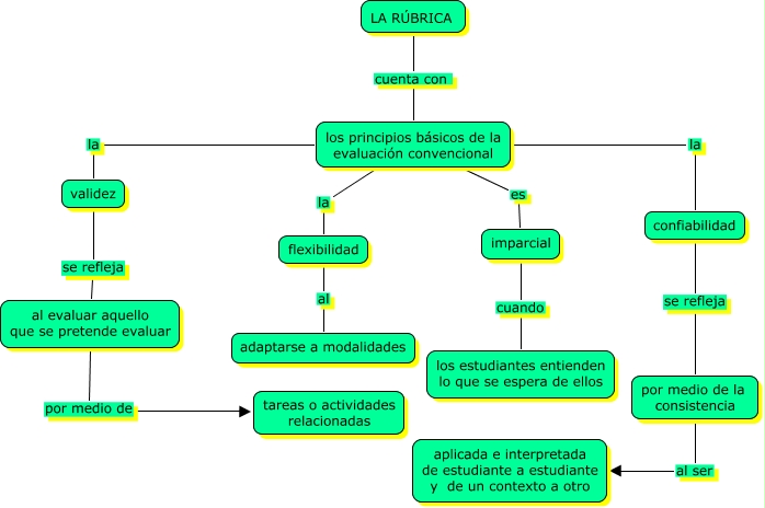 Este Cmap, tiene información relacionada con: como apoyo didactico.f5, confiabilidad se refleja por medio de la consistencia, LA RÚBRICA cuenta con los principios básicos de la evaluación convencional, los principios básicos de la evaluación convencional es imparcial, imparcial cuando los estudiantes entienden lo que se espera de ellos, los principios básicos de la evaluación convencional la validez, por medio de la consistencia al ser aplicada e interpretada de estudiante a estudiante y de un contexto a otro, al evaluar aquello que se pretende evaluar por medio de tareas o actividades relacionadas, flexibilidad al adaptarse a modalidades, los principios básicos de la evaluación convencional la flexibilidad, los principios básicos de la evaluación convencional la confiabilidad, validez se refleja al evaluar aquello que se pretende evaluar