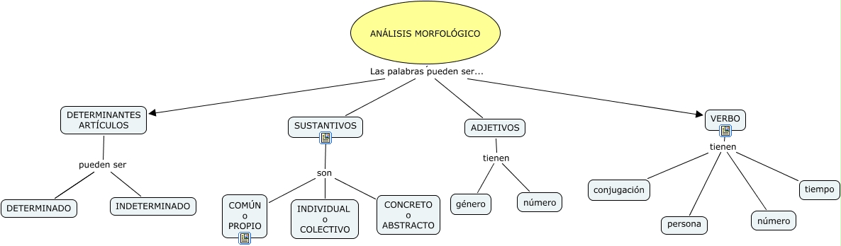 Este Cmap, tiene información relacionada con: Análisis morfológico, SUSTANTIVOS son CONCRETO o ABSTRACTO, ANÁLISIS MORFOLÓGICO Las palabras pueden ser... VERBO, SUSTANTIVOS son INDIVIDUAL o COLECTIVO, DETERMINADO pueden ser INDETERMINADO, SUSTANTIVOS son COMÚN o PROPIO, ANÁLISIS MORFOLÓGICO Las palabras pueden ser... DETERMINANTES ARTÍCULOS, DETERMINANTES ARTÍCULOS pueden ser INDETERMINADO, ADJETIVOS tienen número, VERBO tienen persona, ANÁLISIS MORFOLÓGICO Las palabras pueden ser... ADJETIVOS, VERBO tienen tiempo, DETERMINANTES ARTÍCULOS pueden ser DETERMINADO, VERBO tienen conjugación, VERBO tienen número, ANÁLISIS MORFOLÓGICO Las palabras pueden ser... SUSTANTIVOS, ADJETIVOS tienen género