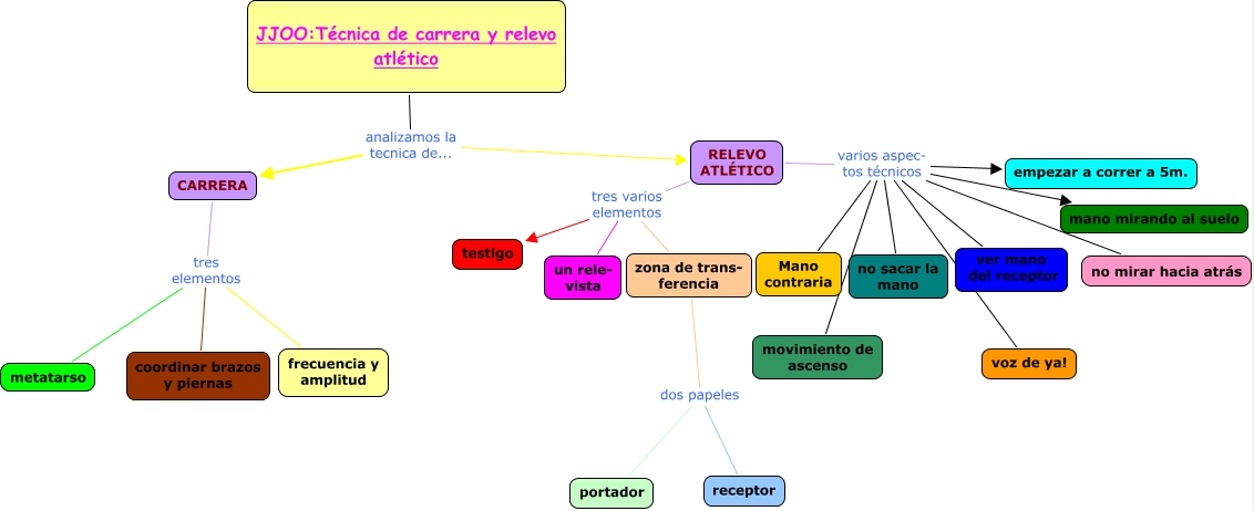 Este Cmap, tiene información relacionada con: JJOOE.F.Ana y Mª Carmen, RELEVO ATLÉTICO tres varios elementos testigo, RELEVO ATLÉTICO varios aspec- tos técnicos movimiento de ascenso, RELEVO ATLÉTICO tres varios elementos un rele- vista, zona de trans- ferencia dos papeles receptor, RELEVO ATLÉTICO tres varios elementos zona de trans- ferencia, RELEVO ATLÉTICO varios aspec- tos técnicos Mano contraria, RELEVO ATLÉTICO varios aspec- tos técnicos no mirar hacia atrás, JJOO:Técnica de carrera y relevo atlético analizamos la tecnica de... CARRERA, RELEVO ATLÉTICO varios aspec- tos técnicos empezar a correr a 5m., RELEVO ATLÉTICO varios aspec- tos técnicos mano mirando al suelo, JJOO:Técnica de carrera y relevo atlético analizamos la tecnica de... RELEVO ATLÉTICO, CARRERA tres elementos frecuencia y amplitud, RELEVO ATLÉTICO varios aspec- tos técnicos ver mano del receptor, CARRERA tres elementos metatarso, CARRERA tres elementos coordinar brazos y piernas, RELEVO ATLÉTICO varios aspec- tos técnicos voz de ya!, zona de trans- ferencia dos papeles portador, RELEVO ATLÉTICO varios aspec- tos técnicos no sacar la mano