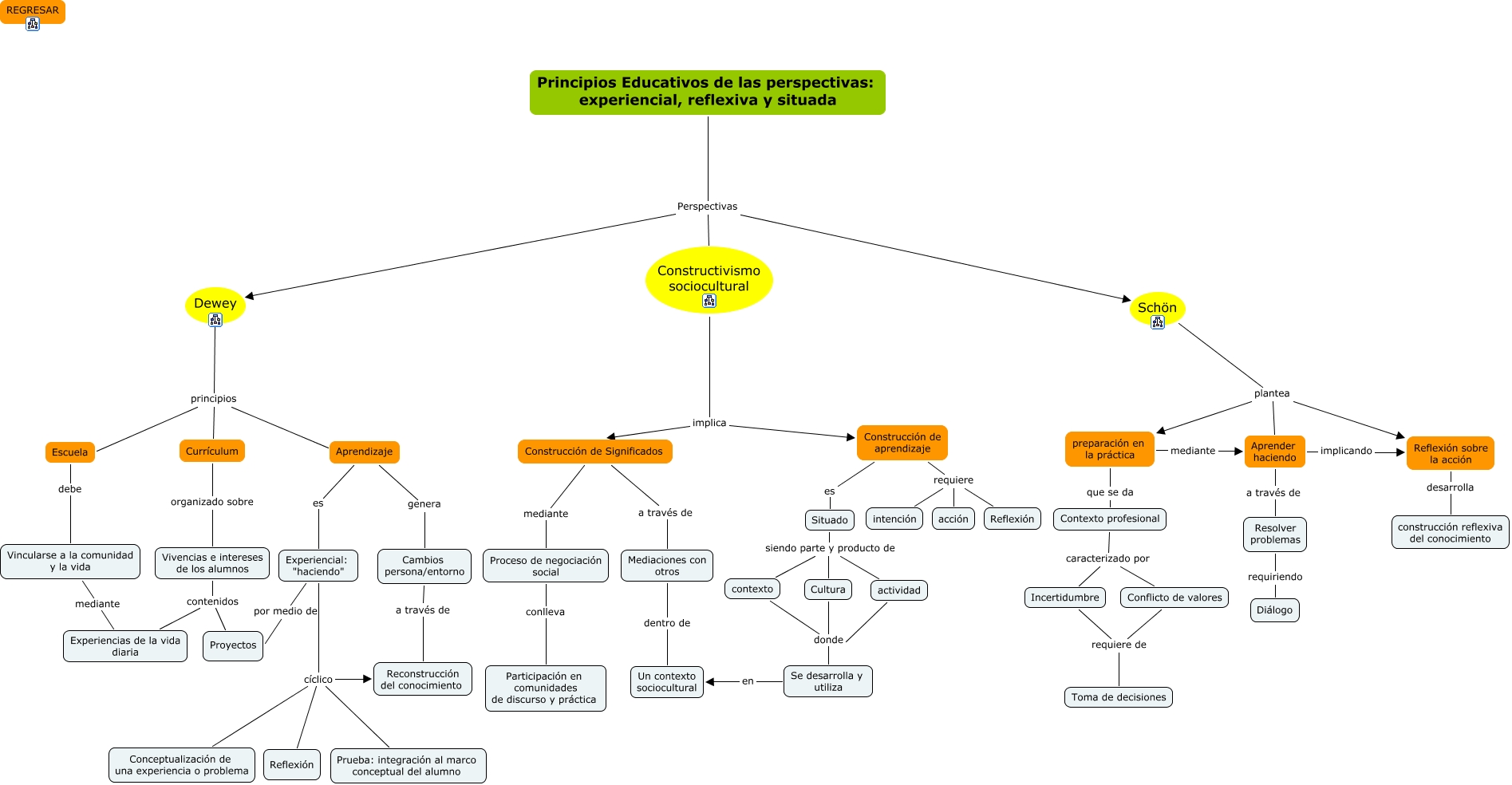 Este Cmap, tiene información relacionada con: Principios educativos de las perspectivas experiencial, reflexiva y situada, preparación en la práctica que se da Contexto profesional, Situado siendo parte y producto de actividad, Experiencial: "haciendo" cíclico Reconstrucción del conocimiento, Contexto profesional caracterizado por Incertidumbre, Aprender haciendo a través de Resolver problemas, Construcción de Significados mediante Proceso de negociación social, Principios Educativos de las perspectivas: experiencial, reflexiva y situada Perspectivas Dewey, preparación en la práctica mediante Aprender haciendo, Situado siendo parte y producto de contexto, Aprender haciendo implicando Reflexión sobre la acción, Schön plantea preparación en la práctica, Experiencial: "haciendo" cíclico Prueba: integración al marco conceptual del alumno, Schön plantea Reflexión sobre la acción, Experiencial: "haciendo" por medio de Proyectos, Construcción de aprendizaje es Situado, contexto donde Se desarrolla y utiliza, Principios Educativos de las perspectivas: experiencial, reflexiva y situada Perspectivas Schön, Construcción de aprendizaje requiere Reflexión, Escuela debe Vincularse a la comunidad y la vida, Cultura donde Se desarrolla y utiliza