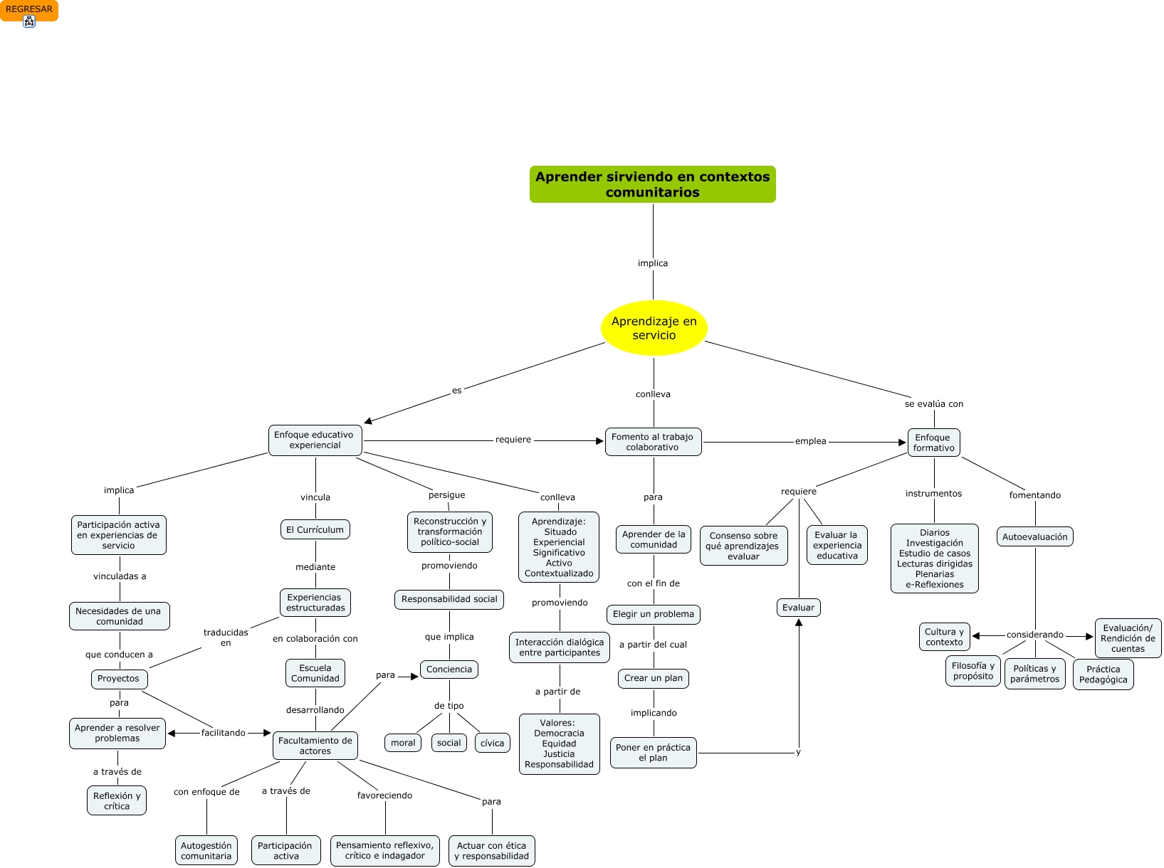 Este Cmap, tiene información relacionada con: Aprender sirviendo en contextos comunitarios, Facultamiento de actores favoreciendo Pensamiento reflexivo, crítico e indagador, Enfoque educativo experiencial implica Participación activa en experiencias de servicio, Evaluar requiere Consenso sobre qué aprendizajes evaluar, Autoevaluación considerando Políticas y parámetros, El Currículum mediante Experiencias estructuradas, Facultamiento de actores para Actuar con ética y responsabilidad, Aprendizaje: Situado Experiencial Significativo Activo Contextualizado promoviendo Interacción dialógica entre participantes, Autoevaluación considerando Cultura y contexto, Experiencias estructuradas en colaboración con Escuela Comunidad, Proyectos para Aprender a resolver problemas, Aprendizaje en servicio conlleva Fomento al trabajo colaborativo, Experiencias estructuradas traducidas en Proyectos, Proyectos facilitando Facultamiento de actores, Conciencia de tipo social, Elegir un problema a partir del cual Crear un plan, Autoevaluación considerando Filosofía y propósito, Necesidades de una comunidad que conducen a Proyectos, Proyectos facilitando Aprender a resolver problemas, Evaluar requiere Evaluar la experiencia educativa, Crear un plan implicando Poner en práctica el plan