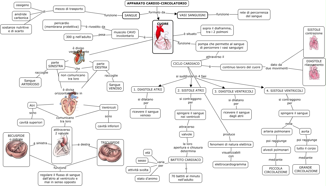 Esse mapa conceitual, produzido no IHMC CmapTools, tem a informação relacionada a: cuore, arteria polmonare poi raggiunge alveoli polmonari, mezzo di trasporto di anidride carbonica, valvole la loro apertura e chiusura determina BATTITO CARDIACO, atttraverso 2 valvole a sinistra BICUSPIDE o mitrale, Atri comunicano tra loro atttraverso 2 valvole, mezzo di trasporto di ossigeno, CUORE funzione pompa che permette al sangue di percorrere i vasi sanguigni, pompa che permette al sangue di percorrere i vasi sanguigni attraverso il CICLO CARDIACO, APPARATO CARDIO-CIRCOLATORIO formato da CUORE, spingere il sangue nella aorta, BICUSPIDE o mitrale funzione regolare il flusso di sangue dall'atrio al ventricolo e mai in senso opposto, CICLO CARDIACO è continuo lavoro del cuore, TRICUSPIDE funzione regolare il flusso di sangue dall'atrio al ventricolo e mai in senso opposto, CUORE è muscolo CAVO involontario, parte SINISTRA è divisa orizzontalmente in Ventricoli, parte SINISTRA che non comunicano tra loro, VASI SANGUIGNI funzione rete di percorrenza del sangue, APPARATO CARDIO-CIRCOLATORIO formato da SANGUE, parte DESTRA raccoglie Sangue VENOSO, muscolo CAVO involontario è rivestito da pericardio (membrana protettiva)