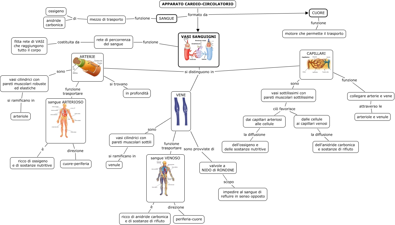 Questa Cmap, creata con IHMC CmapTools, contiene informazioni relative a: vasi sanguigni, mezzo di trasporto di anidride carbonica, mezzo di trasporto di ossigeno, ARTERIE sono vasi cilindrici con pareti muscolari robuste ed elastiche, CUORE funzione motore che permette il trasporto, vasi cilindrici con pareti muscolari sottili si ramificano in venule, APPARATO CARDIO-CIRCOLATORIO formato da CUORE, collegare arterie e vene attraverso le arteriole e venule, VENE sono vasi cilindrici con pareti muscolari sottili, APPARATO CARDIO-CIRCOLATORIO formato da SANGUE, ARTERIE funzione trasportare sangue ARTERIOSO, sangue VENOSO è ricco di anidride carbonica e di sostanze di rifiuto, sangue VENOSO direzione periferia-cuore, dai capillari arteriosi alle cellule la diffusione dell'ossigeno e delle sostanze nutritive, SANGUE funzione mezzo di trasporto, VASI SANGUIGNI si distinguono in VENE, dalle cellule ai capillari venosi la diffusione dell'anidride carbonica e sostanze di rifiuto, rete di percorrenza del sangue costituita da fitta rete di VASI che raggiungono tutto il corpo, VENE funzione trasportare sangue VENOSO, vasi sottilissimi con pareti muscolari sottilissime ciò favorisce dalle cellule ai capillari venosi, vasi cilindrici con pareti muscolari robuste ed elastiche si ramificano in arteriole