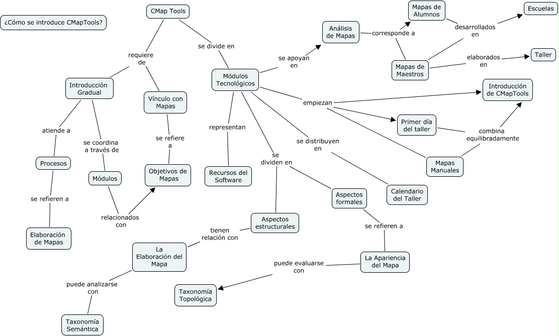 Este Cmap, tiene información relacionada con: CMapTools, CMap Tools requiere de Introducción Gradual, Mapas de Maestros desarrollados en Escuelas, La Apariencia del Mapa puede evaluarse con Taxonomía Topológica, CMap Tools se divide en Módulos Tecnológicos, Módulos Tecnológicos se apoyan en Análisis de Mapas, Módulos Tecnológicos empiezan Primer día del taller, CMap Tools requiere de Vínculo con Mapas, Primer día del taller combina equilibradamente Introducción de CMapTools, Módulos Tecnológicos se dividen en Aspectos estructurales, Aspectos formales se refieren a La Apariencia del Mapa, Aspectos estructurales tienen relación con La Elaboración del Mapa, Introducción Gradual se coordina a través de Módulos, Análisis de Mapas corresponde a Mapas de Alumnos, Introducción Gradual atiende a Procesos, Módulos Tecnológicos se dividen en Aspectos formales, La Elaboración del Mapa puede analizarse con Taxonomía Semántica, Módulos Tecnológicos se distribuyen en Calendario del Taller, Primer día del taller combina equilibradamente Mapas Manuales, Procesos se refieren a Elaboración de Mapas, Módulos Tecnológicos representan Recursos del Software