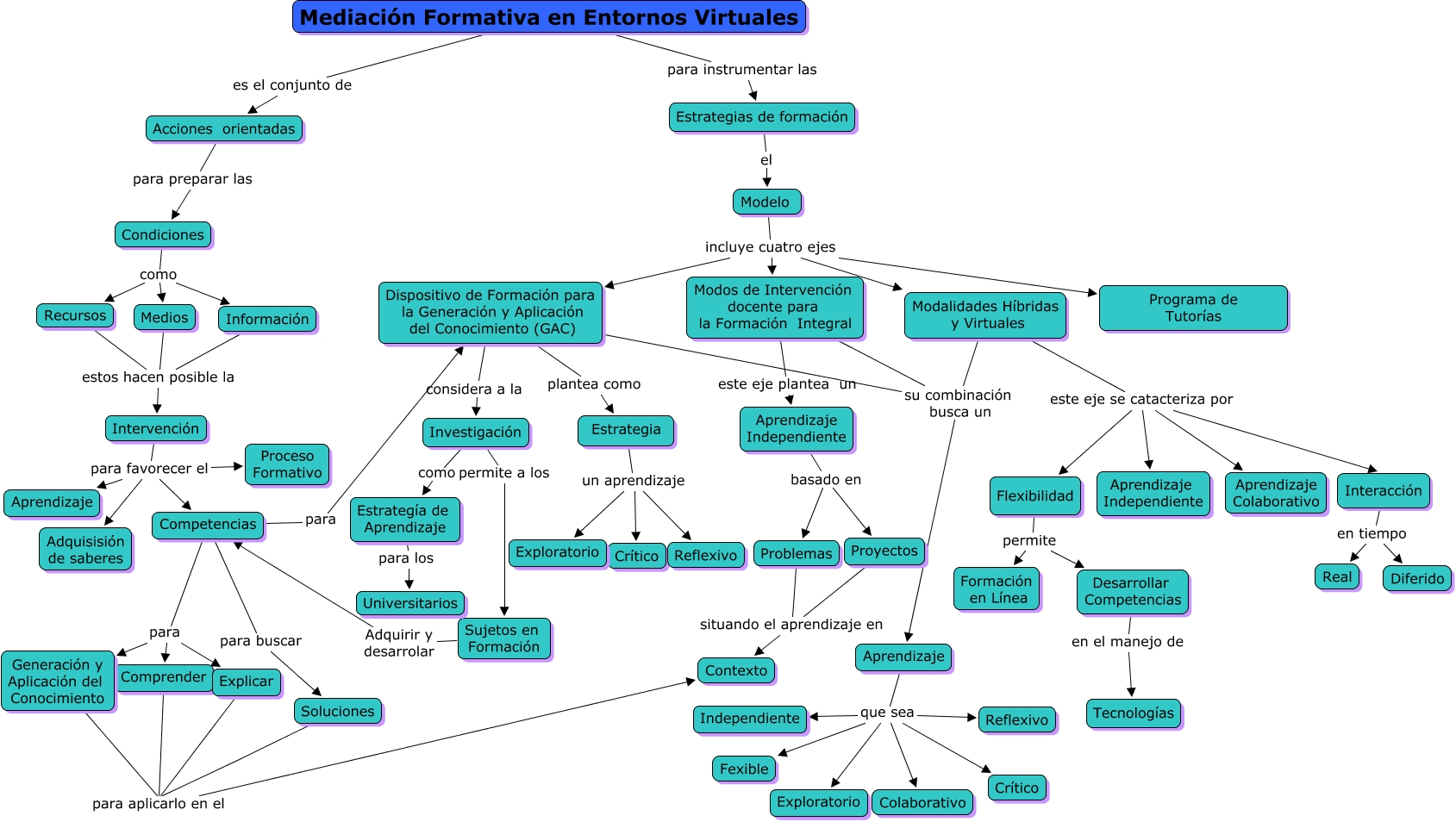 Este Cmap, tiene información relacionada con: Mediación formativa, Condiciones como Medios, Aprendizaje Independiente basado en Proyectos, Investigación como Estrategía de Aprendizaje, Dispositivo de Formación para la Generación y Aplicación del Conocimiento (GAC) considera a la Investigación, Proyectos situando el aprendizaje en Contexto, Estrategia un aprendizaje Exploratorio, Estrategia un aprendizaje Crítico, Desarrollar Competencias en el manejo de Tecnologías, Aprendizaje que sea Independiente, Generación y Aplicación del Conocimiento para aplicarlo en el Contexto, Modalidades Híbridas y Virtuales su combinación busca un Aprendizaje, Modelo incluye cuatro ejes Dispositivo de Formación para la Generación y Aplicación del Conocimiento (GAC), Información estos hacen posible la Intervención, Interacción en tiempo Diferido, Aprendizaje que sea Crítico, Explicar para aplicarlo en el Contexto, Intervención para favorecer el Adquisisión de saberes, Interacción en tiempo Real, Competencias para buscar Soluciones, Condiciones como Recursos