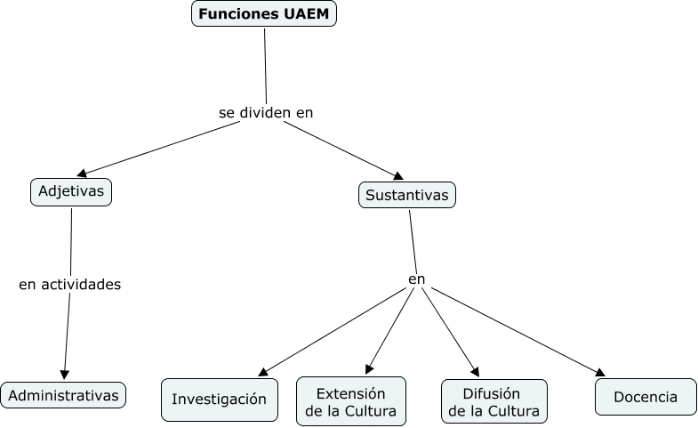 Este Cmap, tiene información relacionada con: Funciones, Sustantivas en Investigación, Sustantivas en Difusión de la Cultura, Funciones UAEM se dividen en Adjetivas, Sustantivas en Docencia, Sustantivas en Extensión de la Cultura, Funciones UAEM se dividen en Sustantivas, Adjetivas en actividades Administrativas