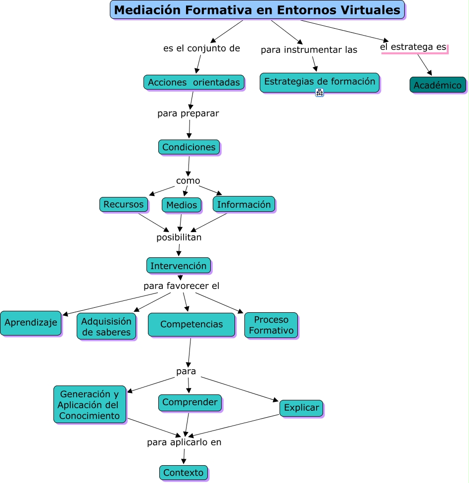 Este Cmap, tiene información relacionada con: Mediación formativa, Mediación Formativa en Entornos Virtuales es el conjunto de Acciones orientadas, Intervención para favorecer el Adquisisión de saberes, Información posibilitan Intervención, Intervención para favorecer el Proceso Formativo, Generación y Aplicación del Conocimiento para aplicarlo en Contexto, Acciones orientadas para preparar Condiciones, Condiciones como Medios, Competencias para Comprender, Explicar para aplicarlo en Contexto, Condiciones como Recursos, Intervención para favorecer el Competencias, Recursos posibilitan Intervención, Competencias para Explicar, Intervención para favorecer el Aprendizaje, Mediación Formativa en Entornos Virtuales el estratega es Académico, Comprender para aplicarlo en Contexto, Medios posibilitan Intervención, Competencias para Generación y Aplicación del Conocimiento, Condiciones como Información, Mediación Formativa en Entornos Virtuales para instrumentar las Estrategias de formación