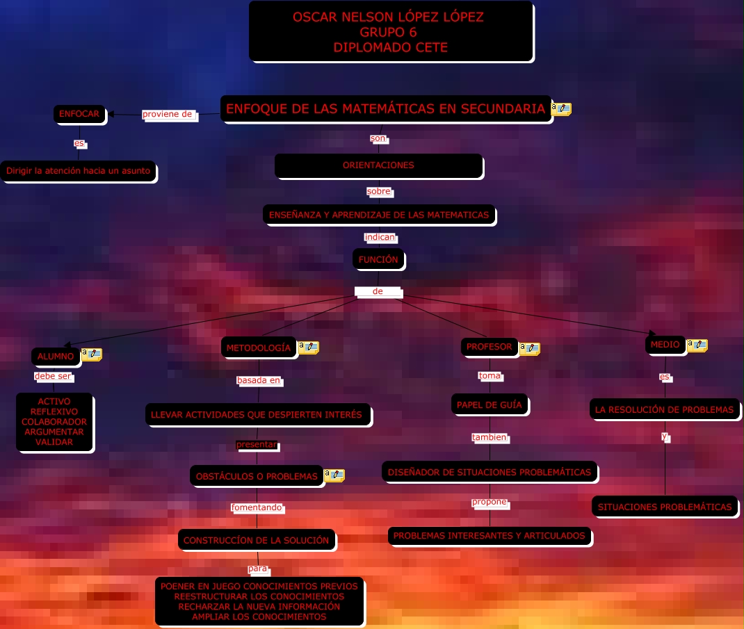 Este Cmap, tiene información relacionada con: ENFOQUE DE MATEMÁTICAS 1, DISEÑADOR DE SITUACIONES PROBLEMÁTICAS propone PROBLEMAS INTERESANTES Y ARTICULADOS, PAPEL DE GUÍA tambien DISEÑADOR DE SITUACIONES PROBLEMÁTICAS, FUNCIÓN de ALUMNO, ENSEÑANZA Y APRENDIZAJE DE LAS MATEMATICAS indican FUNCIÓN, CONSTRUCCÍON DE LA SOLUCIÓN para POENER EN JUEGO CONOCIMIENTOS PREVIOS REESTRUCTURAR LOS CONOCIMIENTOS RECHARZAR LA NUEVA INFORMACIÓN AMPLIAR LOS CONOCIMIENTOS, FUNCIÓN de PROFESOR, ENFOCAR es Dirigir la atención hacia un asunto, LA RESOLUCIÓN DE PROBLEMAS y SITUACIONES PROBLEMÁTICAS, ENFOQUE DE LAS MATEMÁTICAS EN SECUNDARIA son ORIENTACIONES, MEDIO es LA RESOLUCIÓN DE PROBLEMAS, FUNCIÓN de METODOLOGÍA, OBSTÁCULOS O PROBLEMAS fomentando CONSTRUCCÍON DE LA SOLUCIÓN, FUNCIÓN de MEDIO, PROFESOR toma PAPEL DE GUÍA, ORIENTACIONES sobre ENSEÑANZA Y APRENDIZAJE DE LAS MATEMATICAS, ENFOQUE DE LAS MATEMÁTICAS EN SECUNDARIA proviene de ENFOCAR, ALUMNO debe ser ACTIVO REFLEXIVO COLABORADOR ARGUMENTAR VALIDAR, LLEVAR ACTIVIDADES QUE DESPIERTEN INTERÉS presentar OBSTÁCULOS O PROBLEMAS, METODOLOGÍA basada en LLEVAR ACTIVIDADES QUE DESPIERTEN INTERÉS