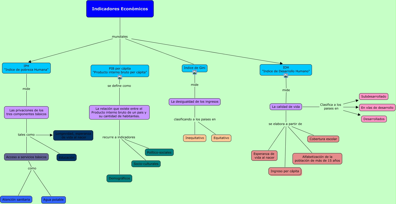 Este Cmap, tiene información relacionada con: indices indicadores, Indicadores Económicos mundiales Indice de Gini, La calidad de vida Clasifica a los paises en Desarrollados, La calidad de vida se elabora a partir de Alfabetización de la población de más de 15 años, Las privaciones de los tres componentes básicos tales como Acceso a servicios básicos, La desigualdad de los ingresos clasificando a los paises en Inequitativo, La relación que existe entre el Producto interno bruto de un pais y su cantidad de habitantes. recurre a indicadores Socio-culturales, Acceso a servicios básicos como Agua potable, Acceso a servicios básicos como Atención sanitaria, Las privaciones de los tres componentes básicos tales como Longevidad, esperanza de vida al nacer, IPH "Indice de pobreza Humana" mide Las privaciones de los tres componentes básicos, Indicadores Económicos mundiales IDH "Indice de Desarrollo Humano", IDH "Indice de Desarrollo Humano" mide La calidad de vida, La calidad de vida se elabora a partir de Cobertura escolar, La relación que existe entre el Producto interno bruto de un pais y su cantidad de habitantes. recurre a indicadores Político-sociales, Indicadores Económicos mundiales IPH "Indice de pobreza Humana", La relación que existe entre el Producto interno bruto de un pais y su cantidad de habitantes. recurre a indicadores Demográficos, La desigualdad de los ingresos clasificando a los paises en Equitativo, PIB per cápita "Producto interno bruto per cápita" se define como La relación que existe entre el Producto interno bruto de un pais y su cantidad de habitantes., Las privaciones de los tres componentes básicos tales como Educación, La calidad de vida se elabora a partir de Ingreso per cápita