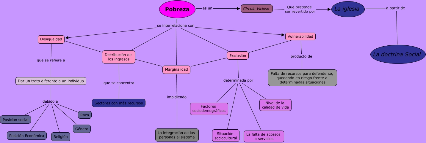 Este Cmap, tiene información relacionada con: pobreeeza, Exclusión determinada por Nivel de la calidad de vida, Pobreza se interrelaciona con Desigualdad, Dar un trato diferente a un individuo debido a Raza, Dar un trato diferente a un individuo debido a Posición Económica, Desigualdad que se refiere a Dar un trato diferente a un individuo, Marginalidad ???? Exclusión, Pobreza se interrelaciona con Vulnerabilidad, Dar un trato diferente a un individuo debido a Género, Pobreza se interrelaciona con Marginalidad, Pobreza se interrelaciona con Exclusión, Distribución de los ingresos que se concentra Sectores con más recursos, Distribución de los ingresos ???? Desigualdad, Exclusión determinada por Factores sociodemográficos, Marginalidad impidiendo La integración de las personas al sistema, Marginalidad ???? Distribución de los ingresos, Dar un trato diferente a un individuo debido a Religión, Círculo Vicioso Que pretende ser revertido por La iglesia, Vulnerabilidad producto de Falta de recursos para defenderse, quedando en riesgo frente a determinadas situaciones, Exclusión determinada por Situación sociocultural, Exclusión determinada por La falta de accesos a servicios