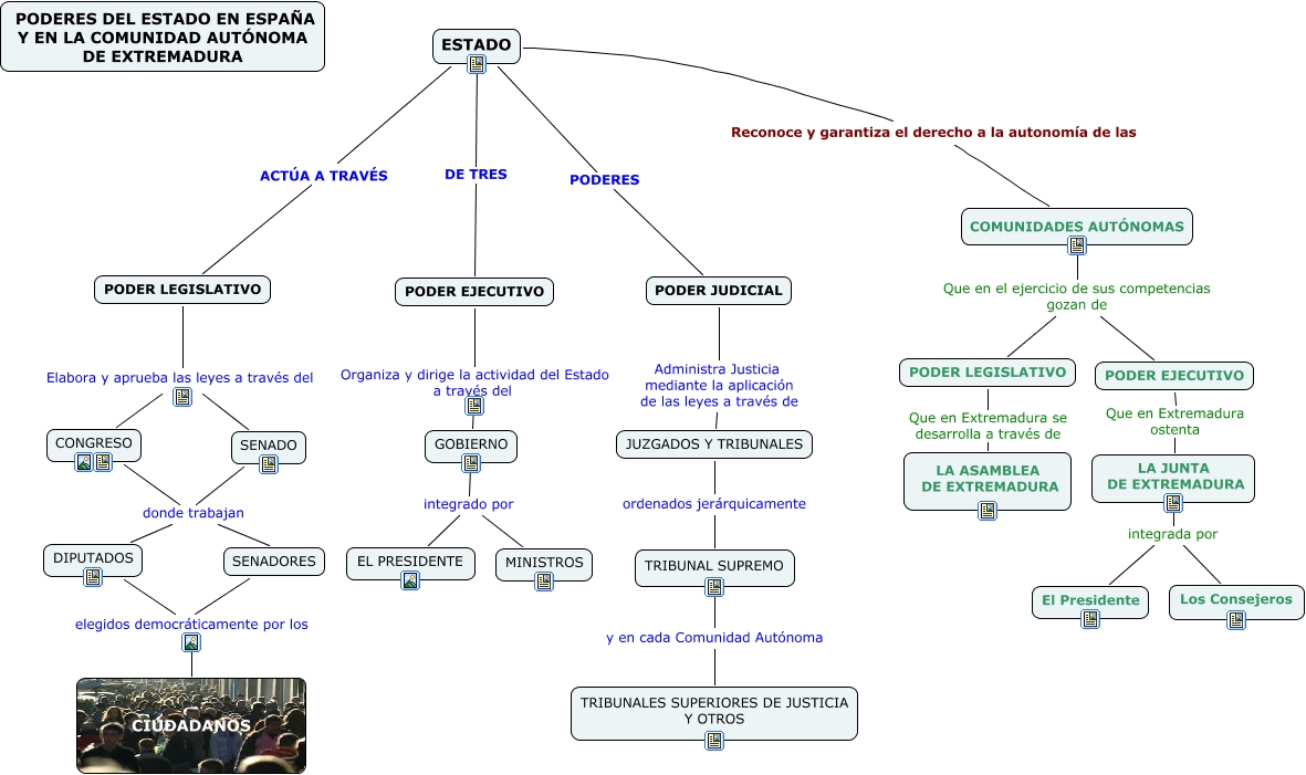 Este Cmap, tiene información relacionada con: PODERES DEL ESTADO Y DE LA CA DE EXTREMADURA, PODER LEGISLATIVO Elabora y aprueba las leyes a través del SENADO, CONGRESO donde trabajan SENADORES, SENADO donde trabajan SENADORES, CONGRESO donde trabajan DIPUTADOS, PODER EJECUTIVO Organiza y dirige la actividad del Estado a través del GOBIERNO, DIPUTADOS elegidos democráticamente por los CIUDADANOS, LA JUNTA DE EXTREMADURA integrada por El Presidente, LA JUNTA DE EXTREMADURA integrada por Los Consejeros, COMUNIDADES AUTÓNOMAS Que en el ejercicio de sus competencias gozan de PODER EJECUTIVO, SENADORES elegidos democráticamente por los CIUDADANOS, TRIBUNAL SUPREMO y en cada Comunidad Autónoma TRIBUNALES SUPERIORES DE JUSTICIA Y OTROS, ESTADO Reconoce y garantiza el derecho a la autonomía de las COMUNIDADES AUTÓNOMAS, GOBIERNO integrado por EL PRESIDENTE, PODER EJECUTIVO Que en Extremadura ostenta LA JUNTA DE EXTREMADURA, PODER LEGISLATIVO Que en Extremadura se desarrolla a través de LA ASAMBLEA DE EXTREMADURA, GOBIERNO integrado por MINISTROS, COMUNIDADES AUTÓNOMAS Que en el ejercicio de sus competencias gozan de PODER LEGISLATIVO, ESTADO ACTÚA A TRAVÉS PODER LEGISLATIVO, PODER LEGISLATIVO Elabora y aprueba las leyes a través del CONGRESO, ESTADO DE TRES PODER EJECUTIVO