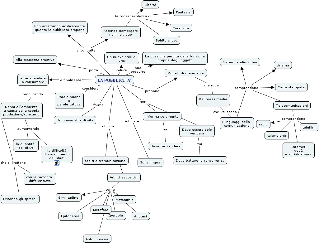 lapubblicita, Facendo riemergere nell'individuo la consapevolezza di Creatività, Danni all'ambiente a causa della coppia produzione/consumo che si limitano con la raccorlta differenziata, Facendo riemergere nell'individuo la consapevolezza di Fantasia, Telecomunicazioni comprendono radio, Artifici espositivi come Antitesi, Telecomunicazioni comprendono telefilm, Facendo riemergere nell'individuo la consapevolezza di Libertà, LA PUBBLICITA' porta Alla sicurezza emotiva, i linguaggi della comunicazione comprendono Carta stampata, Danni all'ambiente a causa della coppia produzione/consumo aumentando la quantità dei rifiuti