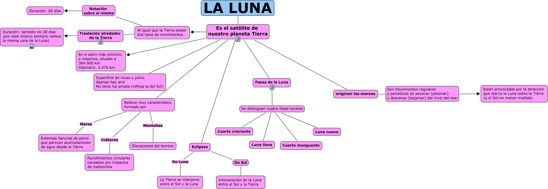 Este Cmap, tiene información relacionada con: La Luna, Fases de la Luna Se distinguen cuatro fases lunares Cuarto creciente, LA LUNA Es el satélite de nuestro planeta Tierra Fases de la Luna, originan las mareas Son movimientos regulares y periódicos de ascenso (pleamar) y descenso (bajamar) del nivel del mar Están provocadas por la atracción que ejerce la Luna sobre la Tierra (y el Sol en menor medida), Al igual que la Tierra posee dos tipos de movimientos Rotación sobre sí misma Duración: 28 días, Fases de la Luna Se distinguen cuatro fases lunares Luna llena, Relieve muy característico formado por Mares Extensas llanuras de polvo que parecen acumulaciones de agua desde la Tierra, Relieve muy característico formado por Montañas Elevaciones del terreno, Fases de la Luna Se distinguen cuatro fases lunares Cuarto menguante, LA LUNA Es el satélite de nuestro planeta Tierra originan las mareas, LA LUNA Es el satélite de nuestro planeta Tierra Es el astro más próximo a nosotros, situado a 364.000 km Diámetro: 3.476 km, Al igual que la Tierra posee dos tipos de movimientos Traslación alrededor de la Tierra Duración: también de 28 días (por este motivo siempre vemos la misma cara de la Luna), LA LUNA Es el satélite de nuestro planeta Tierra Relieve muy característico formado por, Relieve muy característico formado por Cráteres Hundimientos circulares causados por impactos de meteoritos, LA LUNA Es el satélite de nuestro planeta Tierra Eclipses, LA LUNA Es el satélite de nuestro planeta Tierra Superficie de rocas y polvo Apenas hay aire No tiene luz propia (refleja la del Sol), Eclipses De Sol Interposición de la Luna entre el Sol y la Tierra, LA LUNA Es el satélite de nuestro planeta Tierra Al igual que la Tierra posee dos tipos de movimientos, Fases de la Luna Se distinguen cuatro fases lunares Luna nueva, Eclipses De Luna La Tierra se interpone entre el Sol y la Luna