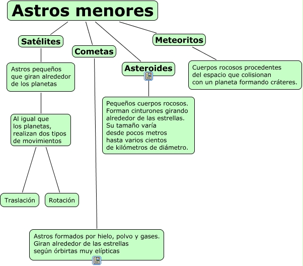 Este Cmap, tiene información relacionada con: Astros menores, Astros menores Satélites Astros pequeños que giran alrededor de los planetas, Astros menores Asteroides Pequeños cuerpos rocosos. Forman cinturones girando alrededor de las estrellas. Su tamaño varía desde pocos metros hasta varios cientos de kilómetros de diámetro., Astros menores Meteoritos Cuerpos rocosos procedentes del espacio que colisionan con un planeta formando cráteres., Astros menores Cometas Astros formados por hielo, polvo y gases. Giran alrededor de las estrellas según órbirtas muy elípticas, Astros pequeños que giran alrededor de los planetas Al igual que los planetas, realizan dos tipos de movimientos Rotación, Astros pequeños que giran alrededor de los planetas Al igual que los planetas, realizan dos tipos de movimientos Traslación