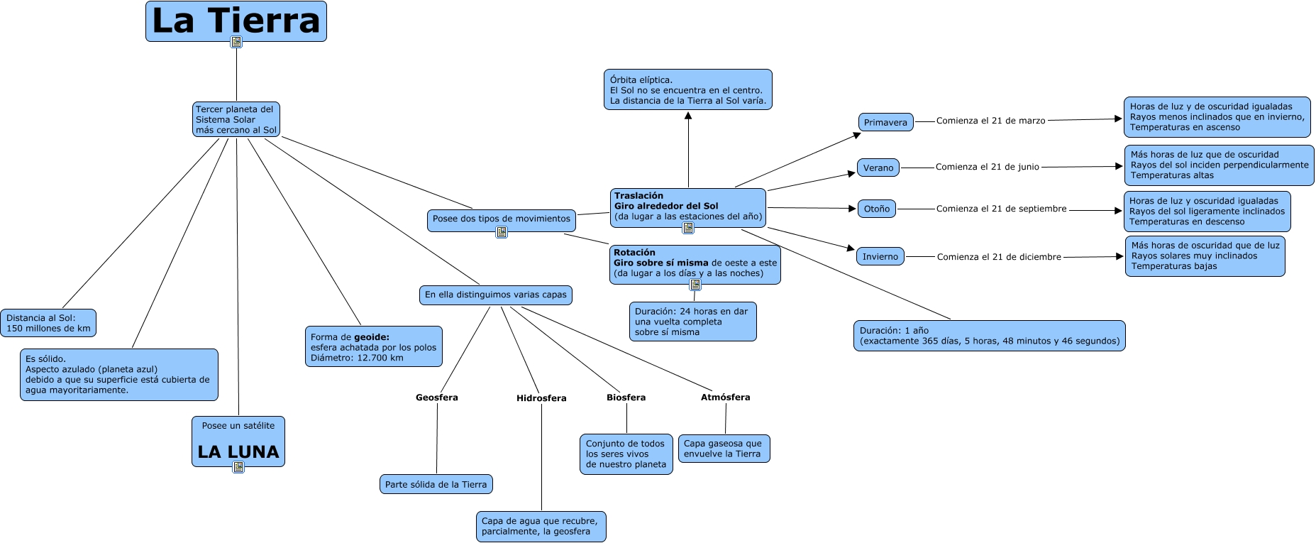 Este Cmap, tiene información relacionada con: La Tierra, Posee dos tipos de movimientos Traslación Giro alrededor del Sol (da lugar a las estaciones del año) Verano, La Tierra Tercer planeta del Sistema Solar más cercano al Sol Posee un satélite LA LUNA, En ella distinguimos varias capas Atmósfera Capa gaseosa que envuelve la Tierra, Posee dos tipos de movimientos Traslación Giro alrededor del Sol (da lugar a las estaciones del año) Invierno, Otoño Comienza el 21 de septiembre Horas de luz y oscuridad igualadas Rayos del sol ligeramente inclinados Temperaturas en descenso, Invierno Comienza el 21 de diciembre Más horas de oscuridad que de luz Rayos solares muy inclinados Temperaturas bajas, La Tierra Tercer planeta del Sistema Solar más cercano al Sol Es sólido. Aspecto azulado (planeta azul) debido a que su superficie está cubierta de agua mayoritariamente., La Tierra Tercer planeta del Sistema Solar más cercano al Sol Forma de geoide: esfera achatada por los polos Diámetro: 12.700 km, Verano Comienza el 21 de junio Más horas de luz que de oscuridad Rayos del sol inciden perpendicularmente Temperaturas altas, Posee dos tipos de movimientos Traslación Giro alrededor del Sol (da lugar a las estaciones del año) Órbita elíptica. El Sol no se encuentra en el centro. La distancia de la Tierra al Sol varía., Posee dos tipos de movimientos Traslación Giro alrededor del Sol (da lugar a las estaciones del año) Duración: 1 año (exactamente 365 días, 5 horas, 48 minutos y 46 segundos), La Tierra Tercer planeta del Sistema Solar más cercano al Sol En ella distinguimos varias capas, Posee dos tipos de movimientos Rotación Giro sobre sí misma de oeste a este (da lugar a los días y a las noches) Duración: 24 horas en dar una vuelta completa sobre sí misma, Posee dos tipos de movimientos Traslación Giro alrededor del Sol (da lugar a las estaciones del año) Primavera, Primavera Comienza el 21 de marzo Horas de luz y de oscuridad igualadas Rayos menos inclinados que en invierno, Temperaturas en ascenso, La Tierra Tercer planeta del Sistema Solar más cercano al Sol Distancia al Sol: 150 millones de km, En ella distinguimos varias capas Geosfera Parte sólida de la Tierra, En ella distinguimos varias capas Biosfera Conjunto de todos los seres vivos de nuestro planeta, En ella distinguimos varias capas Hidrosfera Capa de agua que recubre, parcialmente, la geosfera, Posee dos tipos de movimientos Traslación Giro alrededor del Sol (da lugar a las estaciones del año) Otoño